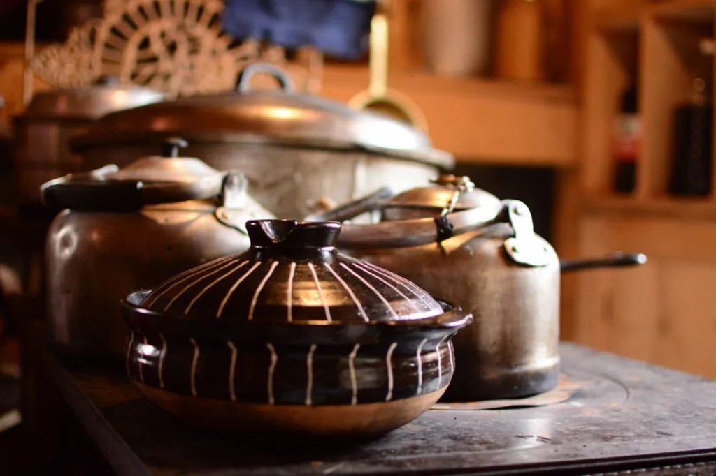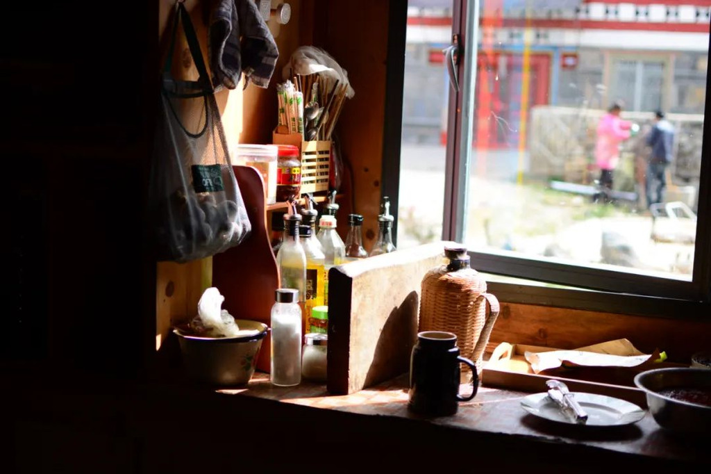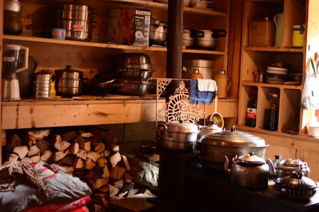 既有古朴,也有现代。炊壶 铝锅 水缸 陶罐挤满了灶台与厨房置物架,木头柴棍堆砌在地上,那是冬日温暖的保障。