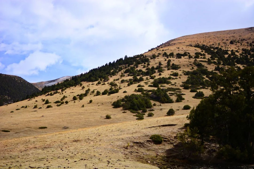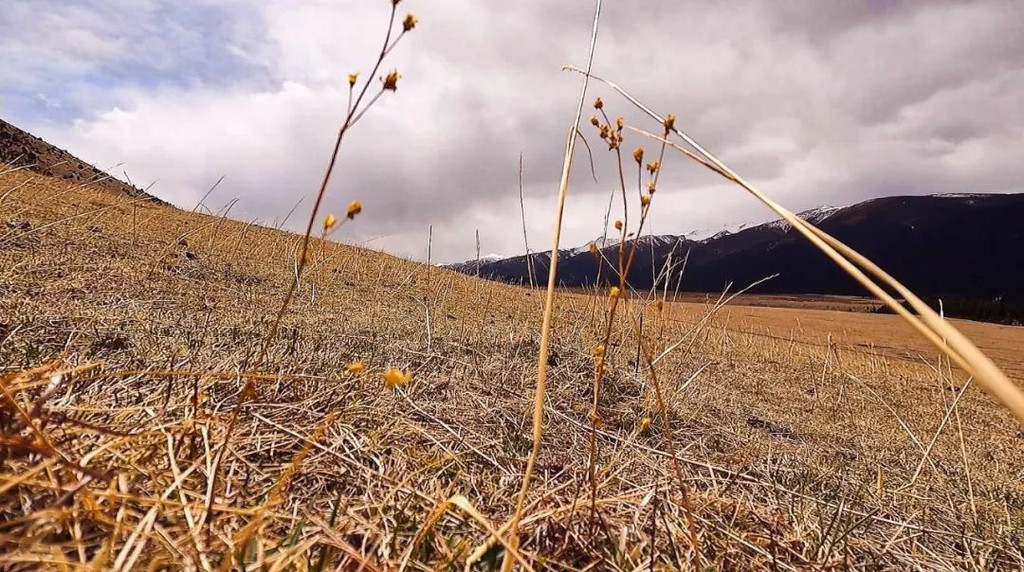 越往上爬,草原越显得枯黄,踩在草上还能听见草杆焦脆的声音。