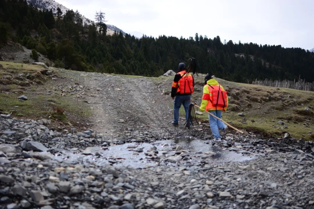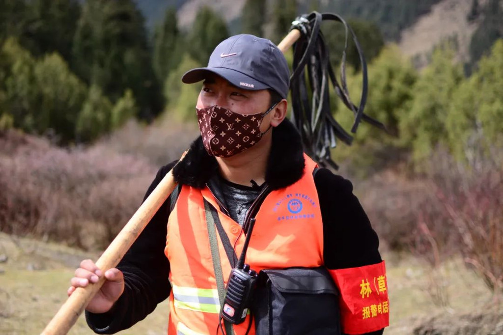 巡护员任重而道远,枯草季节,罗多尼玛大哥每天要背着10公斤重注满水的水桶,扛着灭火用的“橡胶拖把”,进行全程约20公里的巡护,主要是防范火情。拖把在登山途中还可以充当拐杖,以及遇到野生动物时保护自己。