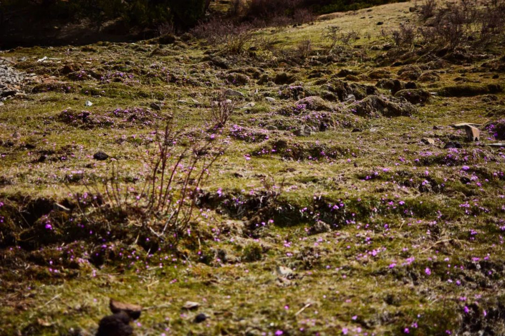 从山底一路往山腰爬,景色也大为不同。冰川融化形成溪流,尽管草原的草还没长起来,但溪水流过的地方已经开出了不少野花。