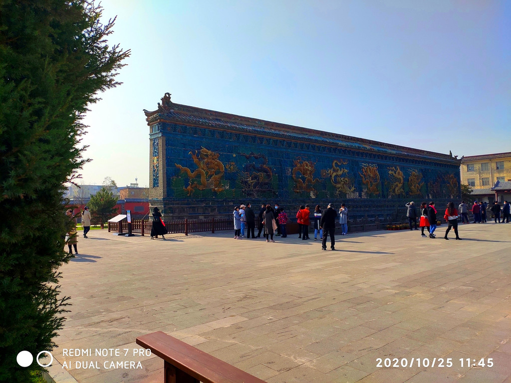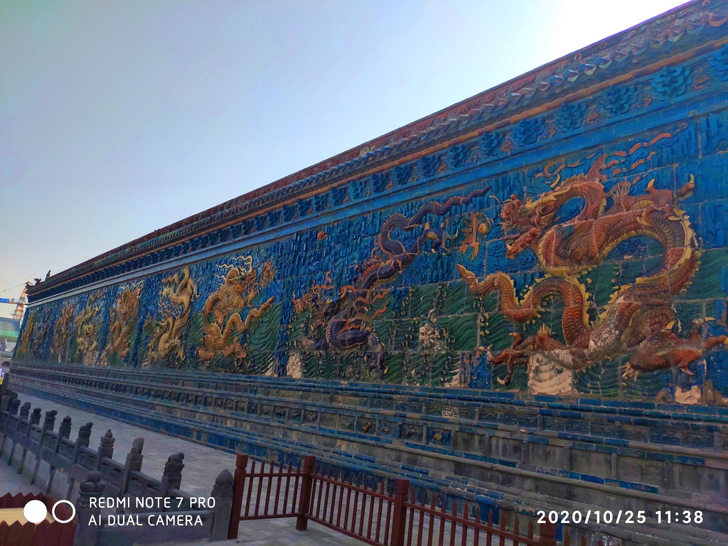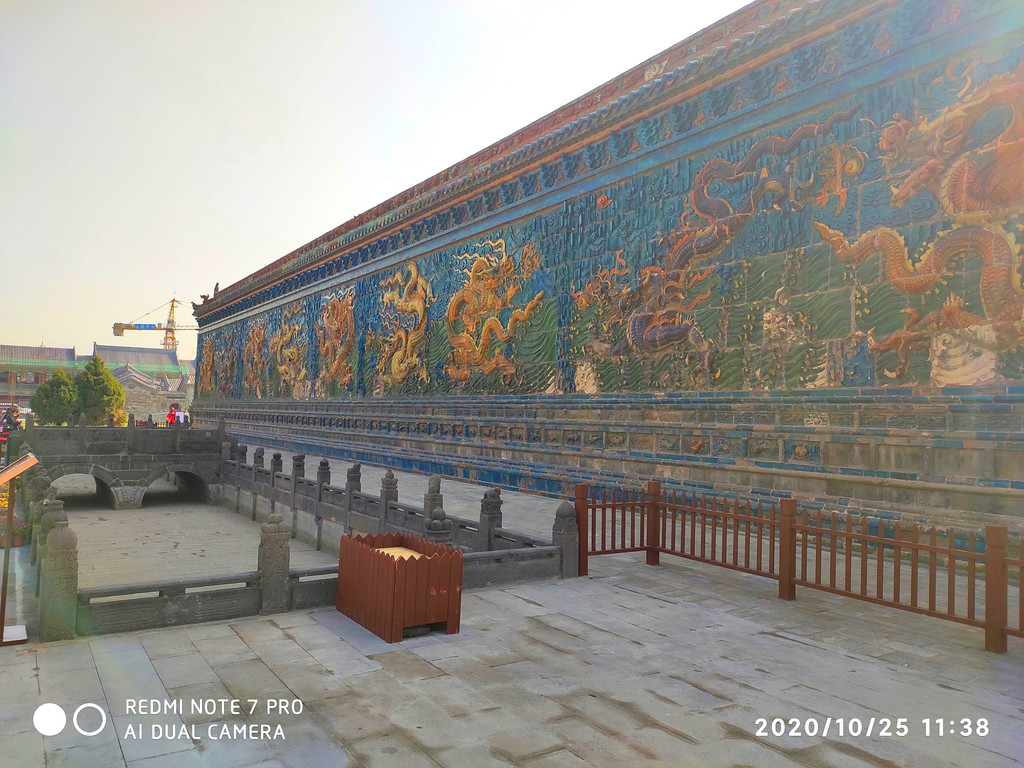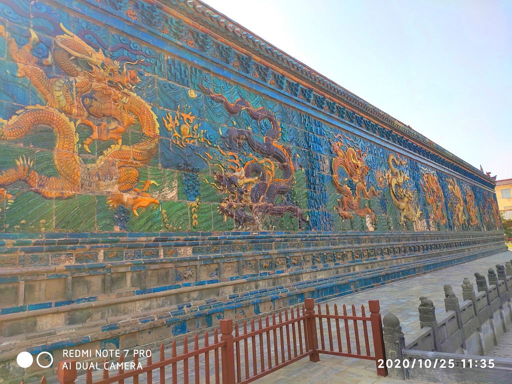来大同,九龙壁成为很多人打卡的地点之一。因为这处九龙壁是中国九龙壁之首。整个九龙壁是由琉璃构件拼砌而成,金碧辉煌,极富艺术魅力。九条龙姿态不一,腾跃于山海之间,气势非凡。中心正龙是一条坐龙,为正黄色,象征着皇权的中心地位,其他的龙均以此为轴,形态飘逸,栩栩如生。