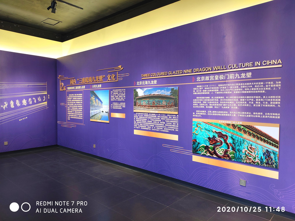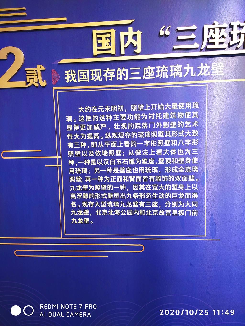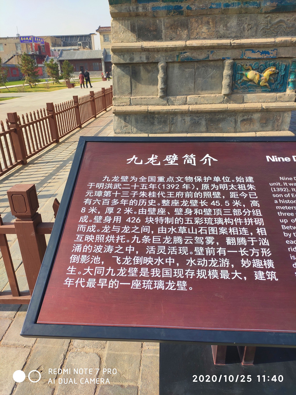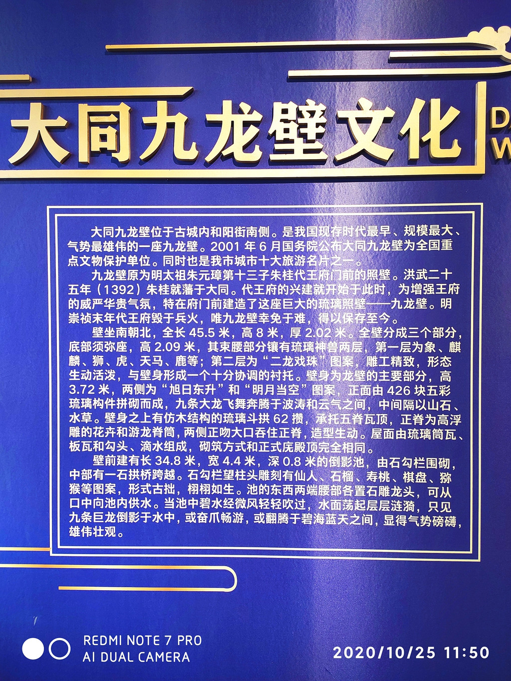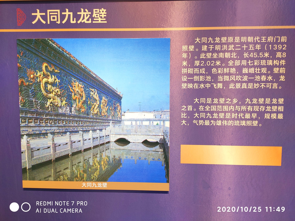 北魏平城时期,大同通过丝绸之路引进了彩色琉璃烧制技术,在中国最早有了琉璃建筑构件。千年之后又成为中国最著名的龙壁之城。据历史学家和当地地方志专家姚斌先生考察统计,大同龙壁直到新中国成立初,尚有大型龙壁16座之多。 其中:一龙壁10座:兴国寺门前双八字团龙壁4座,南北各两座,建于明代。县文庙门前双八字团龙壁,东西各两座。为清代建。东岳庙(在县角街、县楼西北)前八字团龙壁。为清代构建。三龙壁:观音堂门前有双面五彩三龙琉璃龙壁一座,为明代修观音堂时增筑。五龙壁3座:兴国寺五彩琉璃五龙壁,现移至善化寺门前,为明代遗构;天尊庙(道庙)五彩琉璃五龙壁,其址在新营街口,为明代遗物,建国后于上世纪70年代部分倒塌,整体拆后,原件保存在市古建所;县文庙砖雕五团龙壁,位于原第一人民医院对面,为清雍正二年知县佟时华修文庙时增建。五彩琉璃九龙壁一座:原建于代王府端礼门前,为王府照壁,建于明洪武二十五年,二十九年落成。是我国现存三座九龙壁中,年代最早、最高、最大、最巍峨壮观的一座。另外还有原关帝庙对面建的元代戏台一座,该戏台在明隆庆年间代王出资维修时,于戏台后墙增筑“龙鳞照壁”一座,镶嵌在戏台后墙上。此戏台于1959年无端被拆毁,大同唯一的一座元代戏台与这座龙鳞照壁同归于尽。