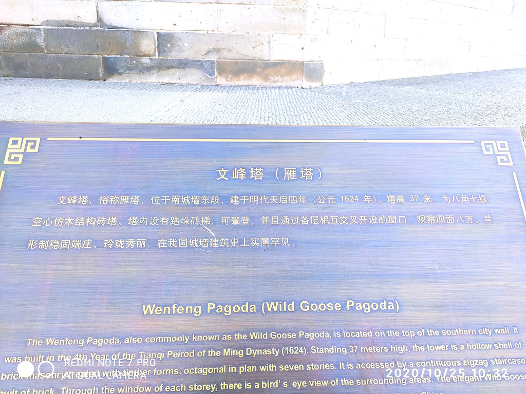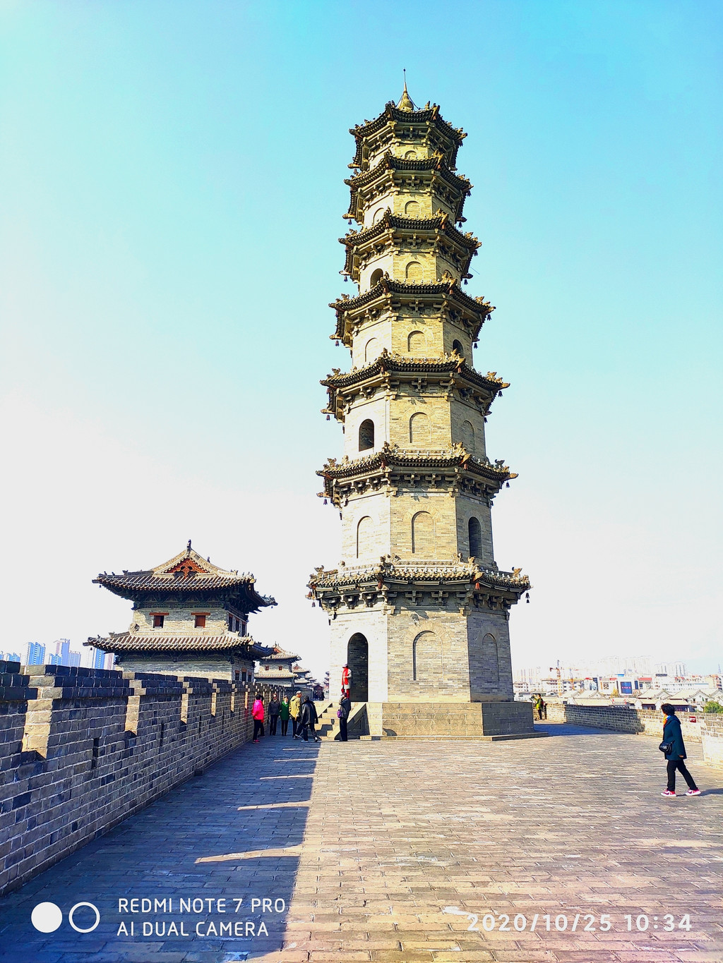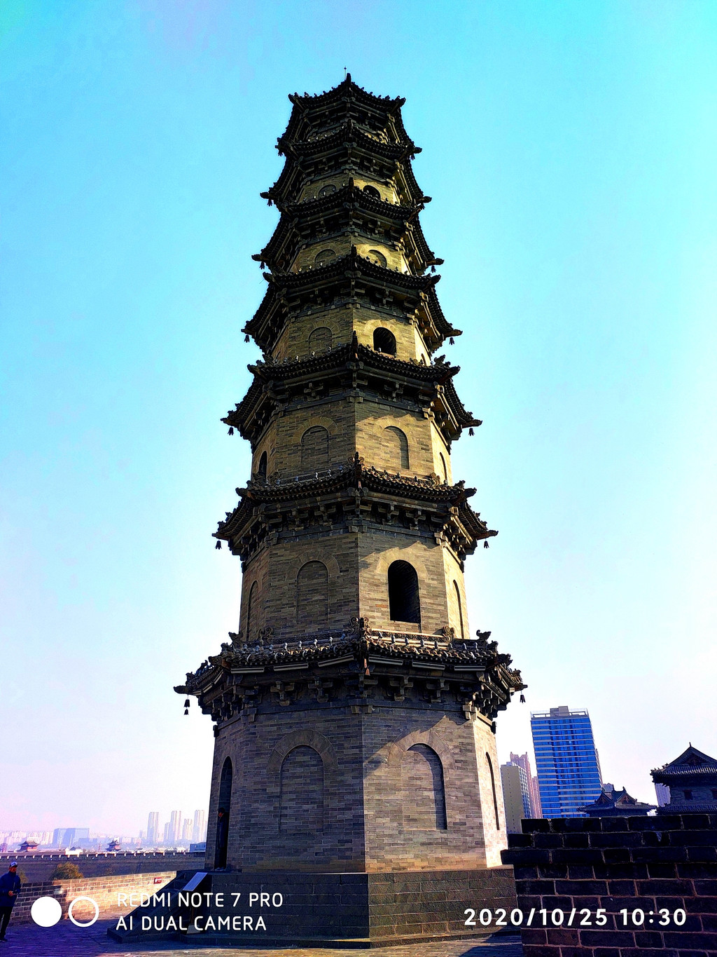 城墙上还修复了一座高约17米的八角七级空心砖塔——雁塔(原名文峰塔),城墙上建塔,我还是第一次见识。