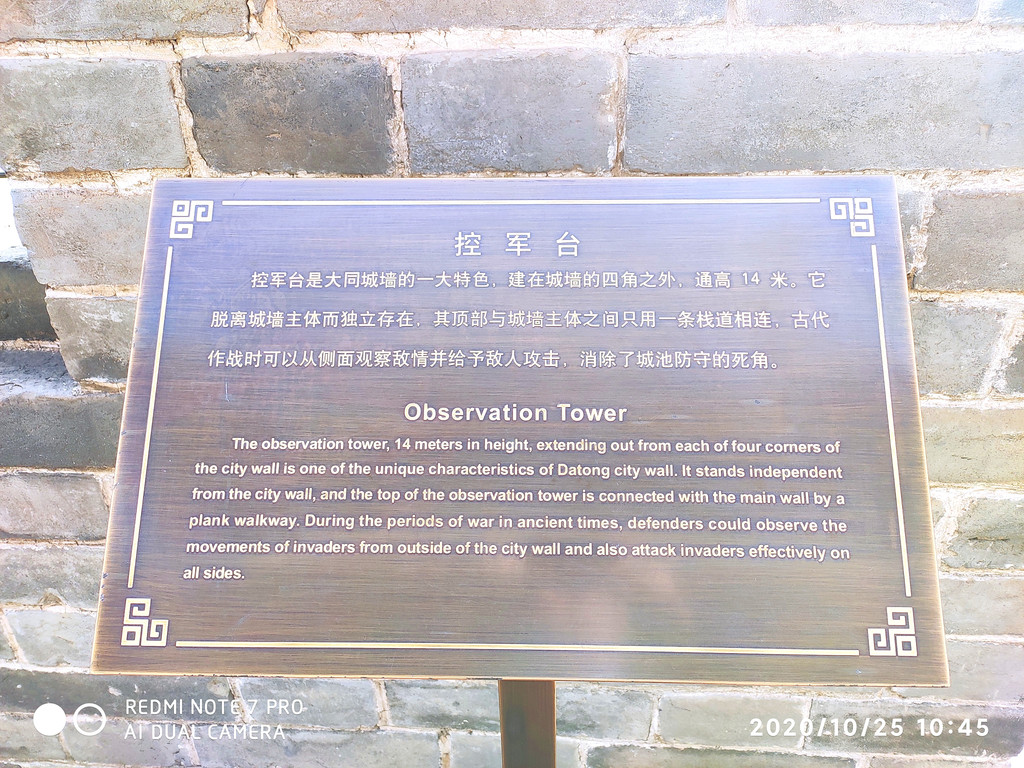 在距两个城角垛子之外,又各建一座12.5×12.5米的“控军台”。控军台四面包砌砖体,与城墙同高,上架木桥连通,这可是大同城墙设防的特殊造型。