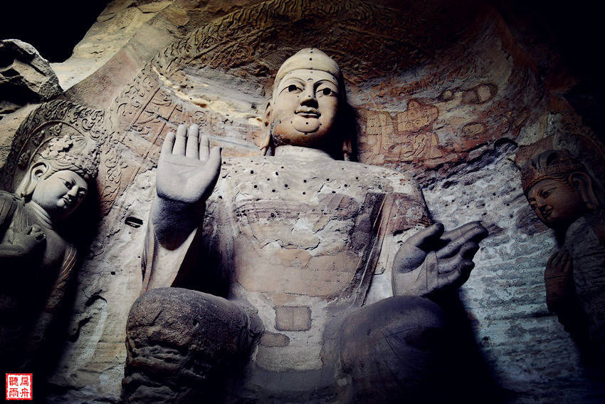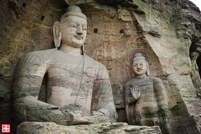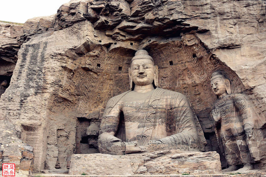 “昙曜五窟”开凿于公元460-465年,是云冈石窟的第一期工程。五个石窟的中央都雕刻了巨大的如来佛像,象征了北魏五朝的五代皇帝,将礼佛和崇拜帝王完美地结合在了一起。
