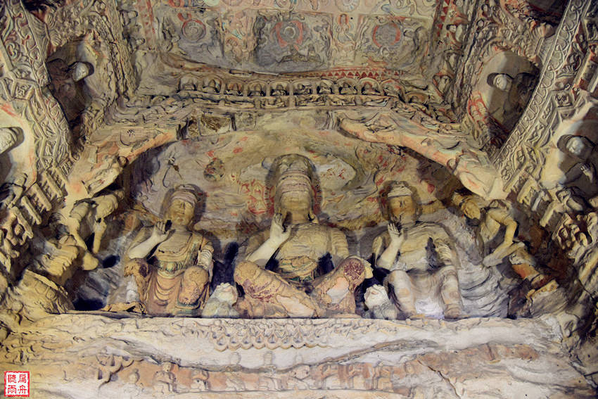 这一时期,洞窟平面多呈方形或长方形,有的洞窟雕中心塔柱,或具前后室,壁面布局上下重层,左右分段,窟顶多有平棊藻井。造像题材内容多样化,突出了释迦、弥勒佛的地位,流行释迦、多宝二佛并坐像,出现了护法天神、伎乐天、供养人行列以及佛本行、本生、因缘和维摩诘故事等。第五窟和第六窟为一组双窟,分前后两室室,后室北壁主像为三世佛,中央坐像高17米,是云冈石窟最大的佛像。两窟窟前建有五间四层楼阁,对石窟进行保护,现存建筑为清初顺治八年(公元1651年)重建。不管是窟里的佛像还是窟顶的壁画和飞天,都被施以彩色的泥塑,艺术价值、精美程度和观赏性都是最为顶级的作品,但一些窟内严禁拍摄,无法用相机呈现给你,只能请客官们自己亲自去欣赏了。