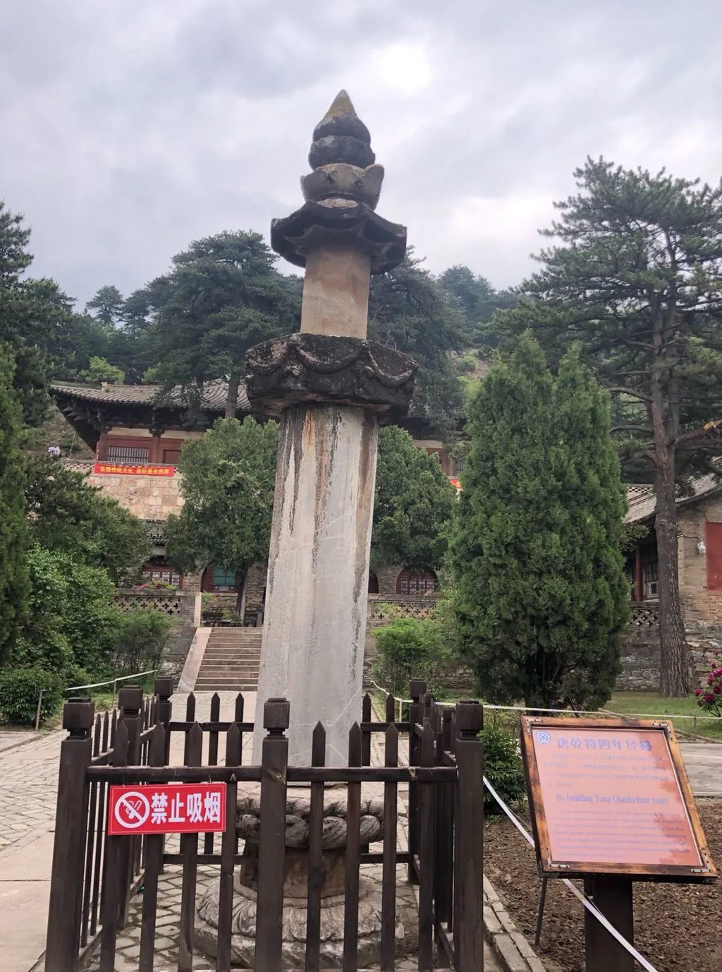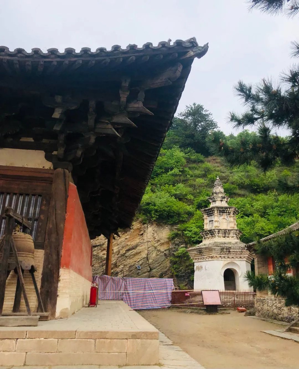 庭中矗立一座4.9米高的唐代石幢,幢身满是岁月的痕迹,上刻陀罗尼经,至今仍可辨认。石幢后面,全寺最高处,正是那座大唐遗构。须爬过一段陡峭的窑洞台阶才能到达。台阶前后都是松树,后面两棵尤其高大,大殿掩映在苍翠之中,若隐若现。