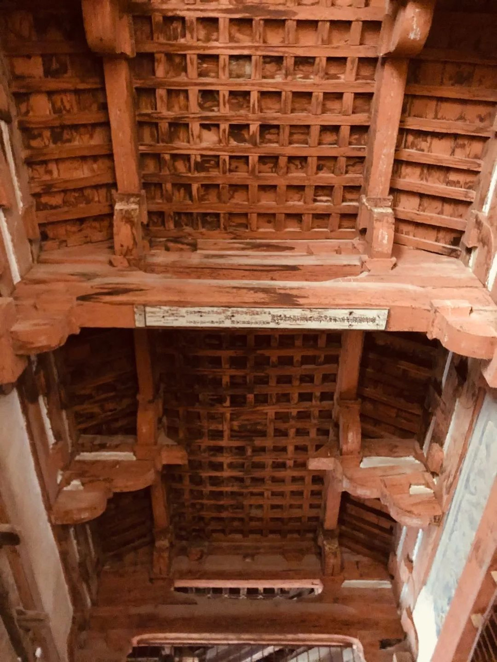 塔外层有二十四根巨柱,张开双臂都抱不下,稳稳撑住木塔外檐,围成八角形走廊。从廊外向上看去,一副副牌匾悬立,麻燕间或栖息梁上,一片祥和。走廊内侧,红墙端立,气质俊秀。麻燕一点都不怕人,就在旁边飞来飞去,雀跃不已,一如我的心情一般。我在走廊上转了一圈又一圈,激动得停不下来,谁能知道我现在多开心!