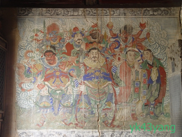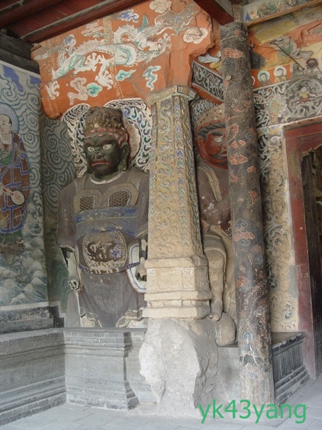 第五窟称为“大佛洞”。分为前后两室。外室两侧石壁上画有壁画,色彩鲜艳,不知年代。通往内室的大门两旁各刻有两尊护法,圆瞪双目,神情严厉。看来凡是执法护法,都是这般凶相。