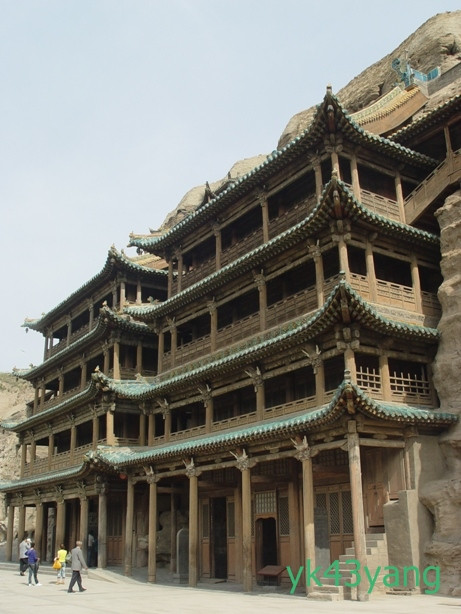 第五窟,第六窟,在石窟群的中部。这是孝文帝迁都洛阳之前(约465——494)年开凿的一组双窟。庙前有清顺治八年依崖而建的五间四层木楼阁,朱红柱栏,琉璃瓦顶,蔚为壮观,为明十八景中的“云岗摩云”。