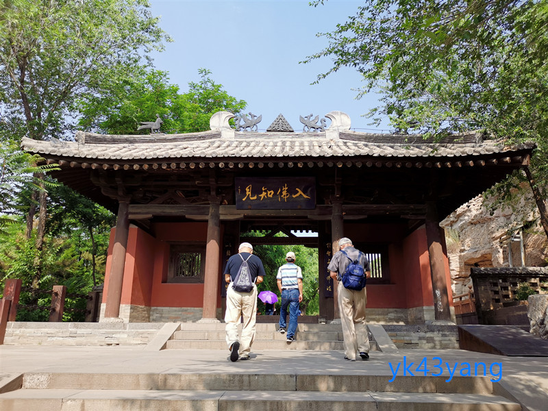 来到了石窟前。这是石窟景区新建的大门。门匾上题“入佛见知”四个金字,意思是入了佛门,才能够获得真知。本人对此,深不以为然。因为现代科技理论,没有一项出自佛门。