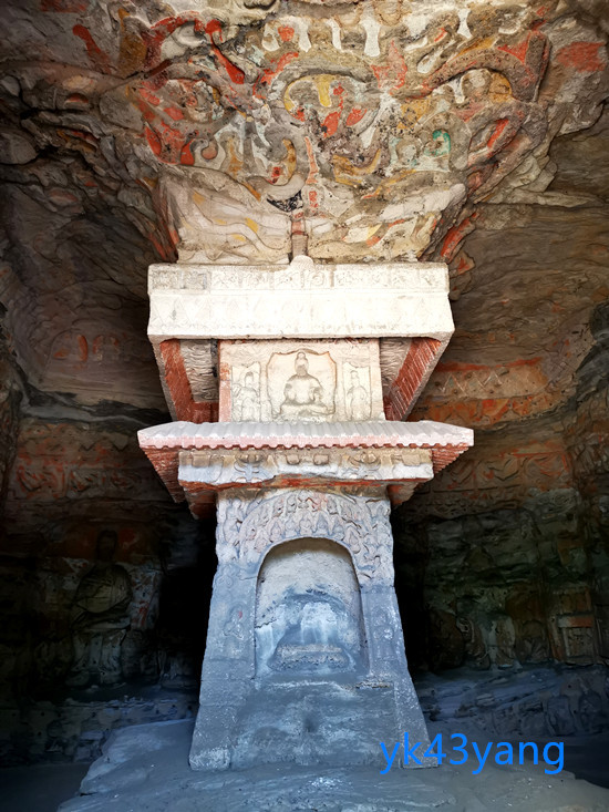 窟顶模仿木构藻井,浮雕24尊飞天,围绕盛开的莲花盘旋飞舞,美丽动人。可惜因为光线问题,六美人和飞天都没有能够拍下照片。