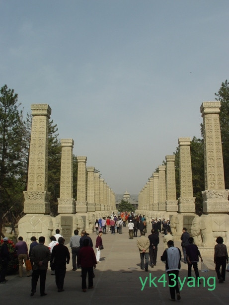 这是一千多米长,东西方向的礼佛大道。大道两边立着十三对“骑象四棱神柱”,神柱高8.73米,看去颇感壮观。但仔细观察,神柱都是水泥制品。