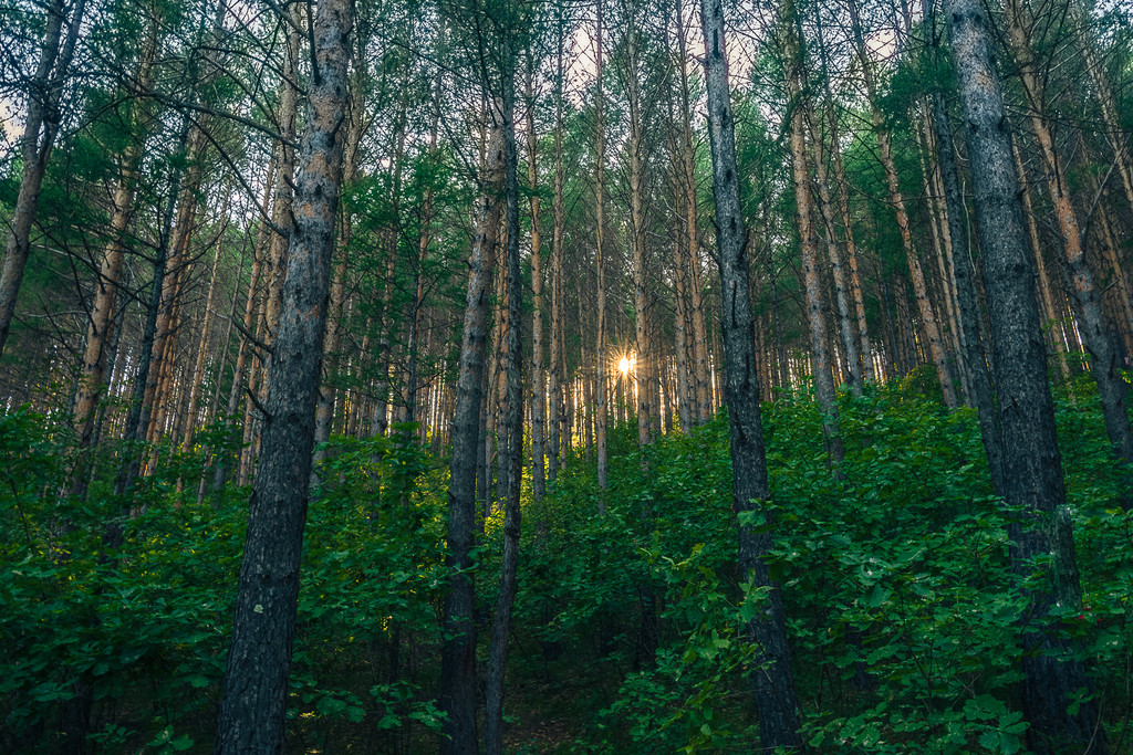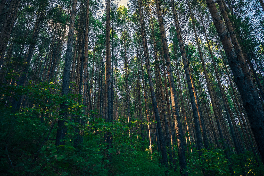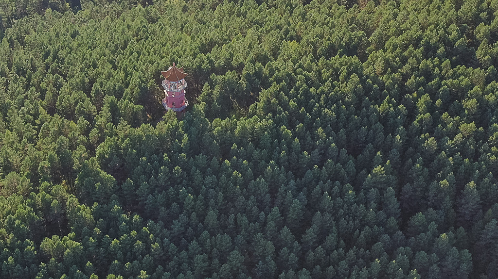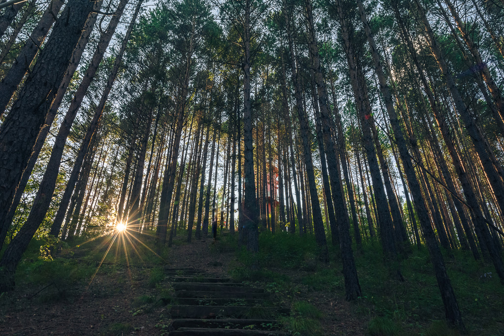 而当你拾级而上走近上山的台阶时,你被高耸入云且密密麻麻的樟子松所包围了,感觉这里更配的上加格达奇这个名字(有樟子松的地方)!可能是由于树木密度大的原因,在山间行走时,气温凉爽,且风似乎被茂密的树林像屏障一样遮挡住吹不进来,舒适的体感加上色调唯美的光影,数百阶的台阶在不到二十分钟的时间便轻松爬到了山顶。