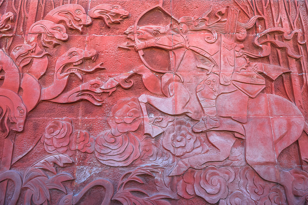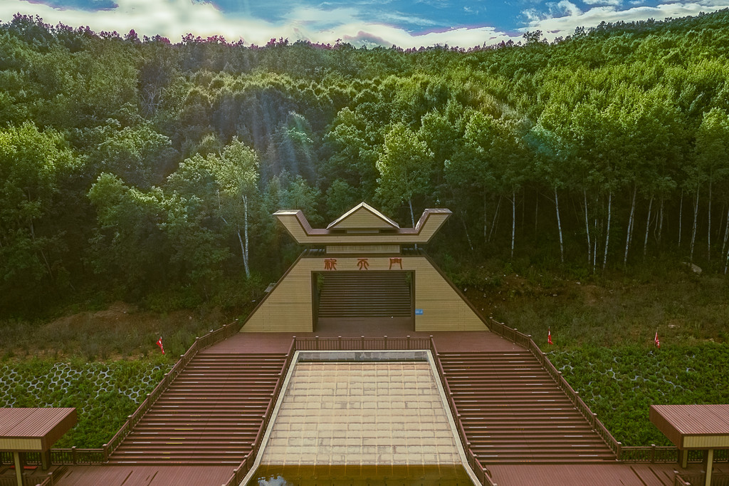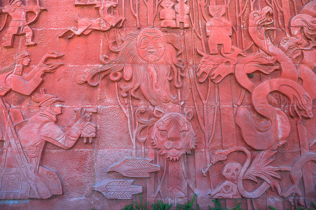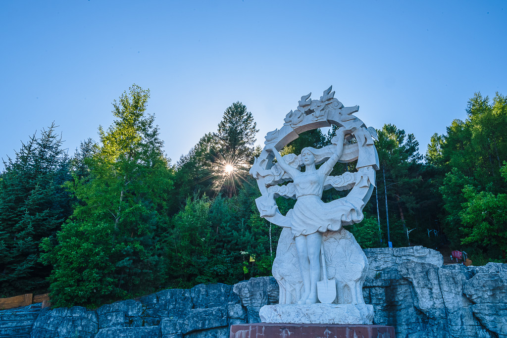 第二站我们来到了塔河县的栖霞山植物园,这里的风景正如栖霞山的名字一样,充满了诗意与浪漫的情怀。景区是免费的,当刚踏上上山的台阶时,巨大的石雕壁画映入眼帘。壁画为红砂岩石雕壁画《鄂伦春之歌》,壁画里的人物与场景似乎讲述着鄂伦春族在赖以生存的大山里狩猎、生活、以及请求神灵保佑祛病祈福等一幕幕日常。而壁画的背后,则是汉白玉雕塑的少女形象,双手托举着祥云与白鸽,脚下则是铁锹和绿树,似乎告诉人们她心中对绿色和平的畅想!