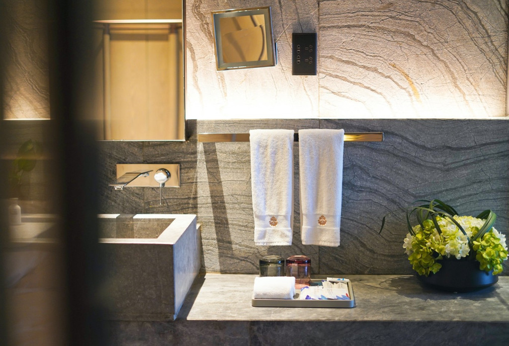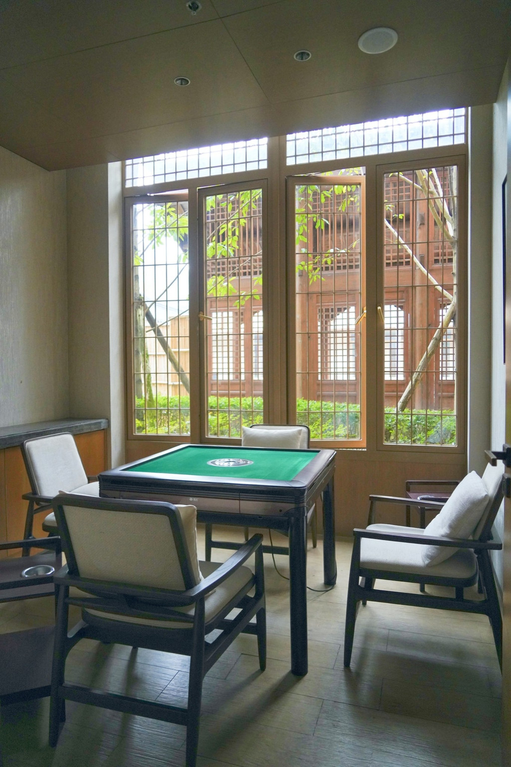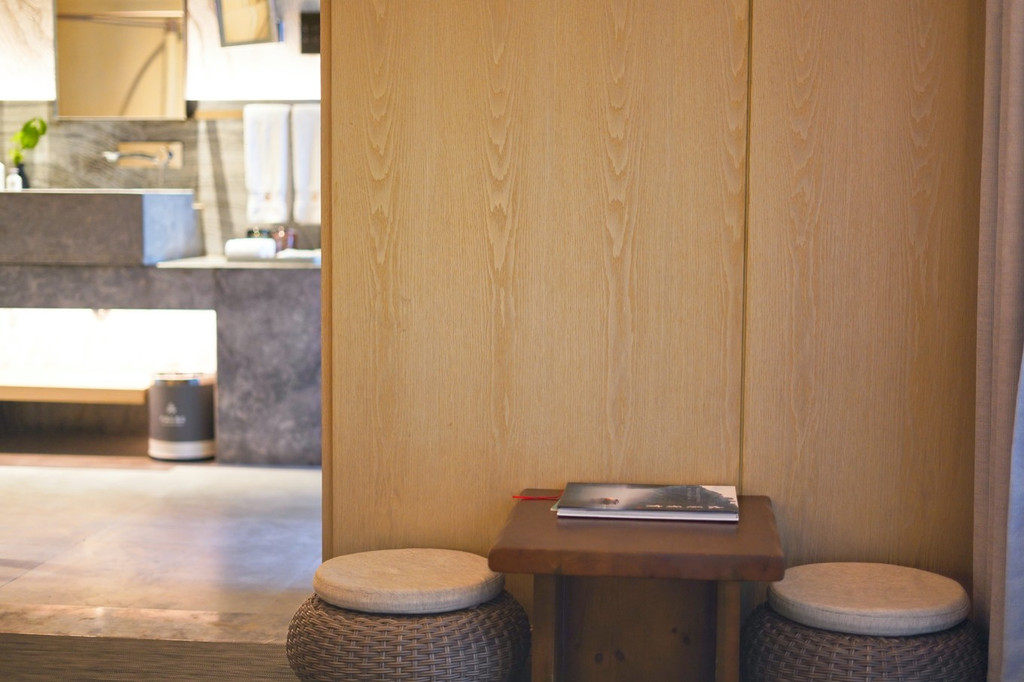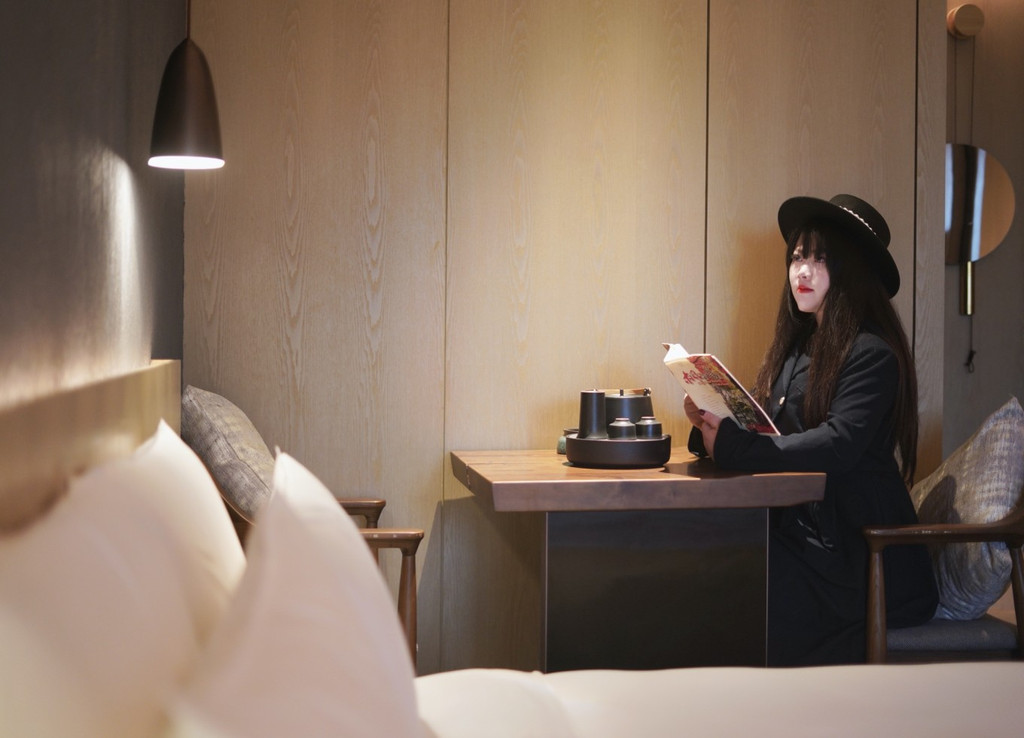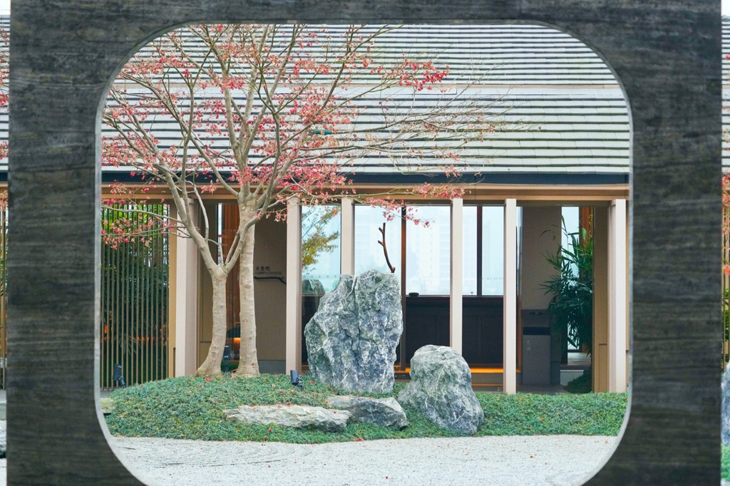 踏门而进,眼前是一座日式风情的庭院。灰黑色的石子铺就的庭院,四周种满了绿植,两颗红枫分居左右,形成了对称的线条美。往左边走,就来到了办理入住的酒店前台,与之相邻的就是酒店休憩的大堂吧。