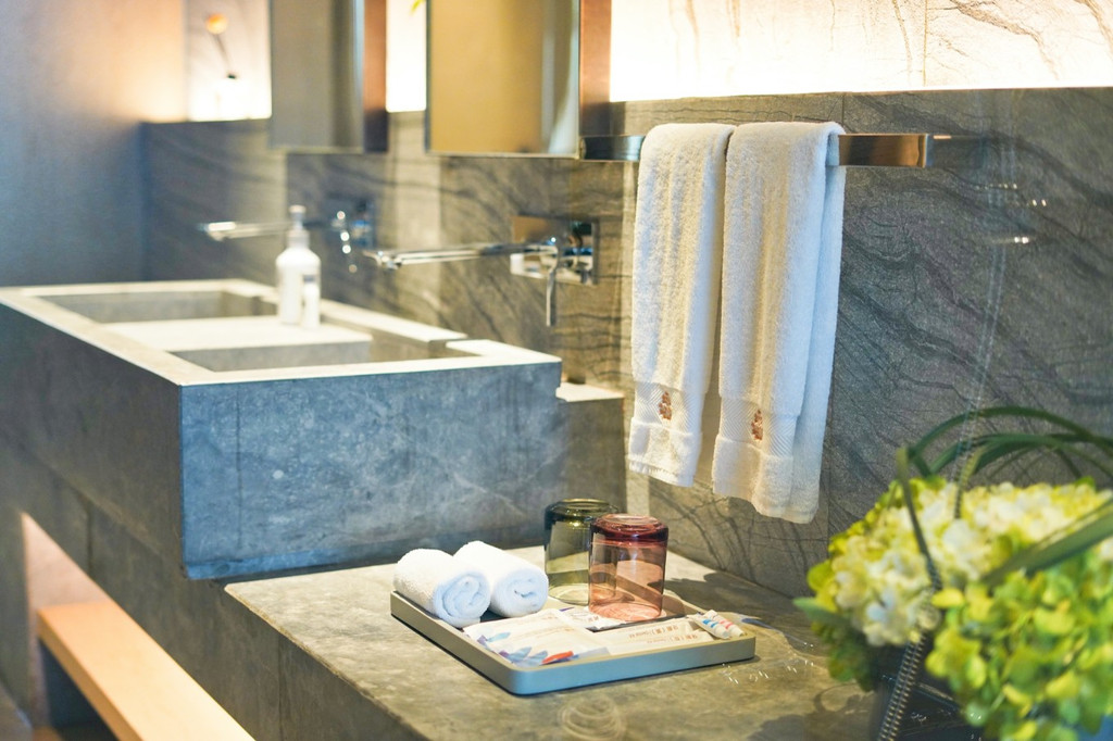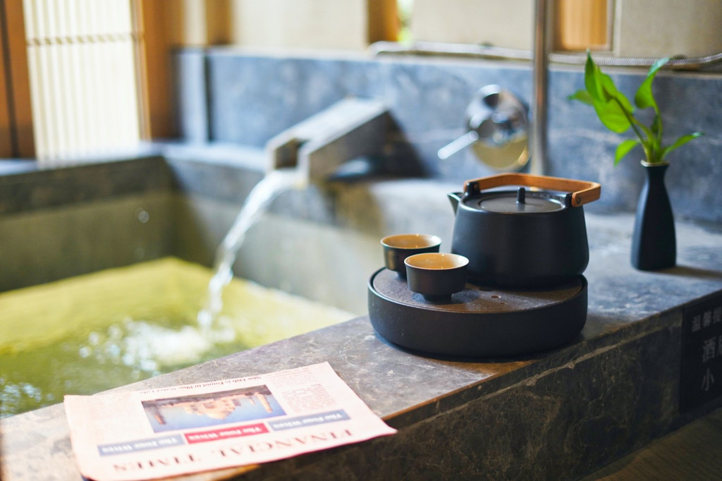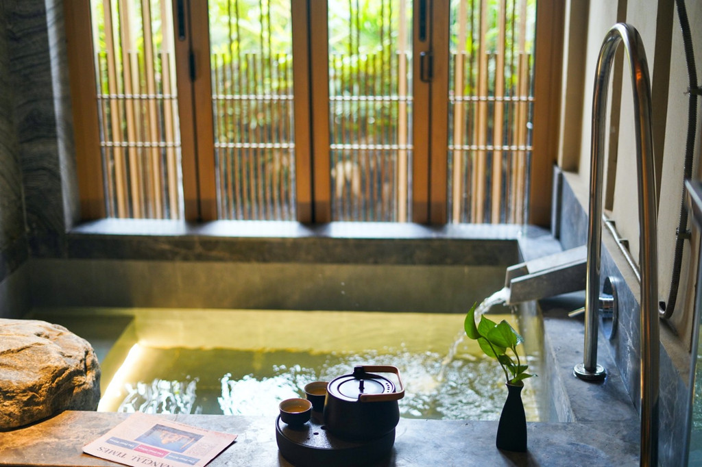 私汤湖景大床房的电视墙背后,就是房间的洗漱区域。干湿分区的设计,尤为人性化。酒店提供了免费的洗漱用品,甚至还有身体乳,尤为贴心。还有一次性拖鞋、浴袍等,即便区公共泡池也很方便。靠近庭院湖景的一侧,就是房间自带的私汤泡池。如果不想去酒店的公共汤池,那么私汤房就是最佳选择。泡一壶清茶,或是来一杯红酒,放着曼妙的音乐,赏着庭院前方的湖光山色,嗅着花园里绽放的百花香,泡一个冬日暖汤。隐于山水之间,独享如此梦幻的假日时光,妙不可言。