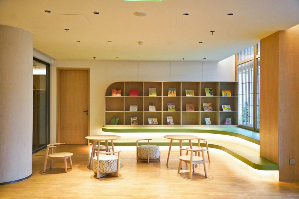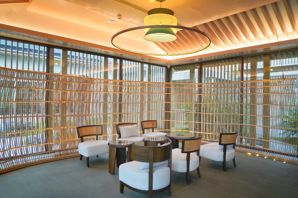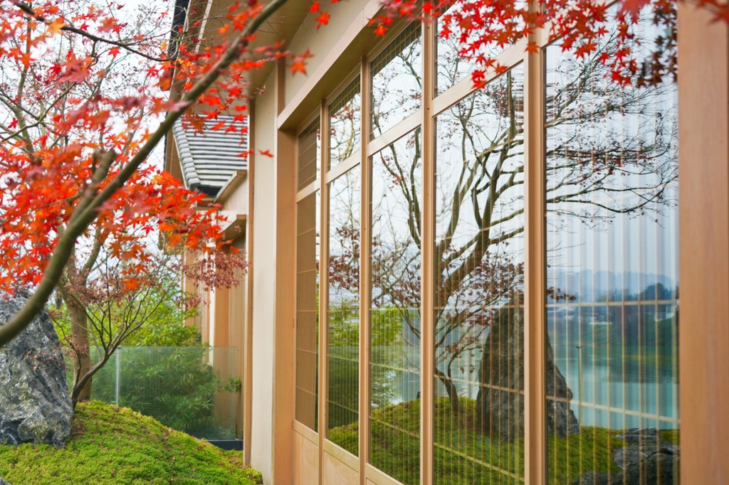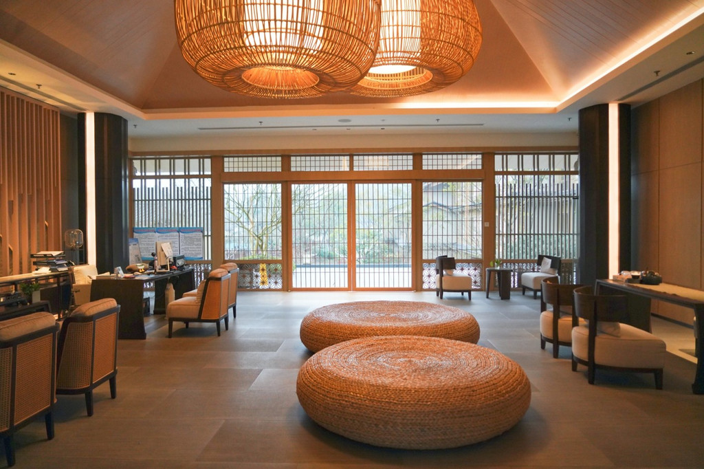 酒店接待前台的一角,也有简易的休憩区。顶部悬挂着一组木质镂空的竹笼灯,下方是两张硕大的圆形日式藤编坐垫并行排列,显得古朴而静美。 走进旁边的大堂休憩区,一股木质香气迎面而来,日式的设计风格显得格调非常舒适。大堂吧采用了对流门的设计,前后两面的美景,即可一眼望穿。一侧为雅致的入门日式庭院,一侧为静美的草湖。在大堂吧喝一壶清茶,阅读一本书卷,近看旖丽的草湖风光,远眺巍巍青山如黛,内心极为宁静,心情愉悦。不知是远山治愈了苦闷的心扉,还是一盏清茶释清欢。