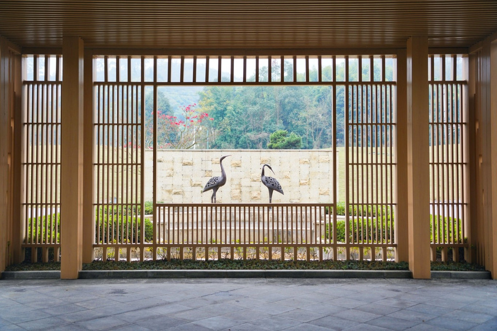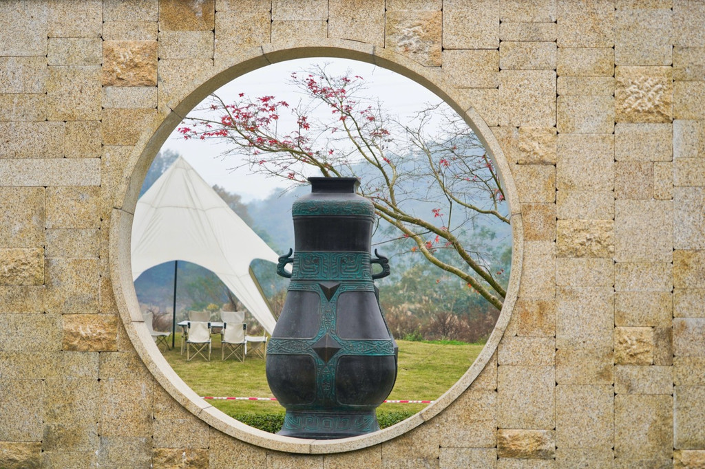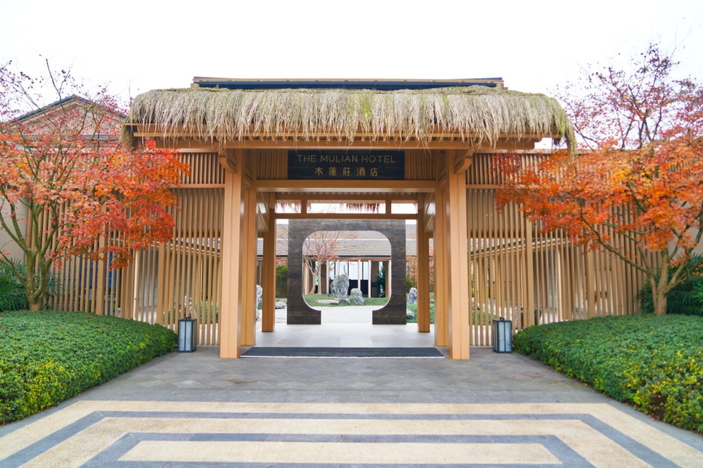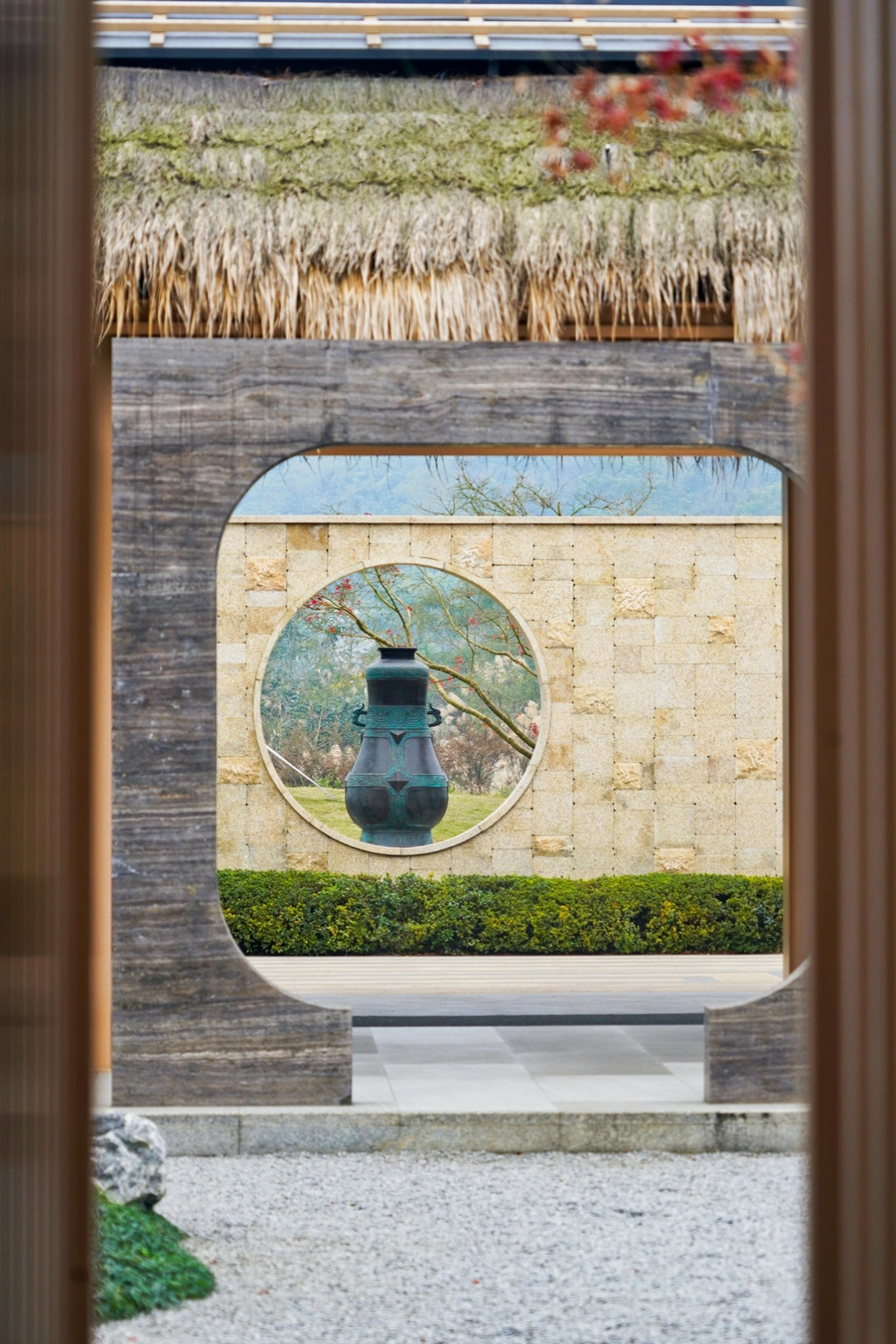 车在画中行,人在景中游。抵达 成都大邑 木莲庄酒店,首先映入眼帘的就是日式草屋的酒店大门,隐于山水之间,犹如一座世外 桃源 。在酒店大门的前方,有一面圆形镂空的石壁,中间放置着一件青铜色的摆件,奢华与艺术同台,显得格外雅致。