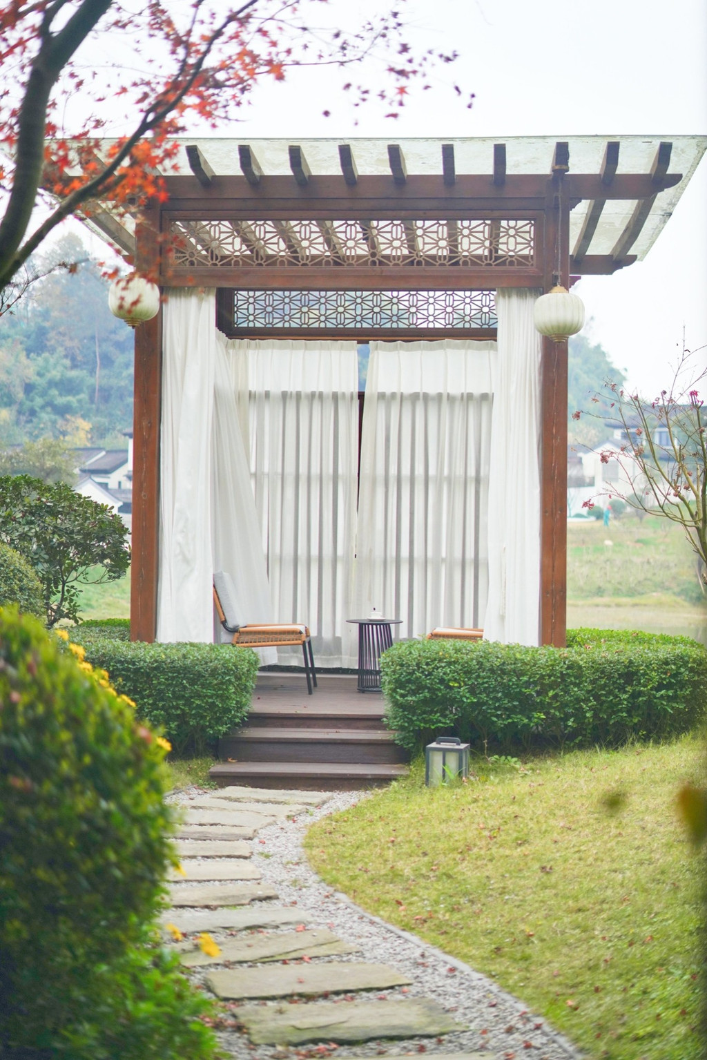 当然木莲庄酒店的私密庭院,同样让我为之着迷。试问谁没有一个屋后自带小花园的旅居梦想呢?在庭院就是里红枫树迎风摇曳,花园里的月季竞相绽放,院子之外就是宽阔的草湖。一半草海,一半碧波。水波微漾的湖面上有三两只黑天鹅遨游其中,整个草湖顿时显得愈发灵动。