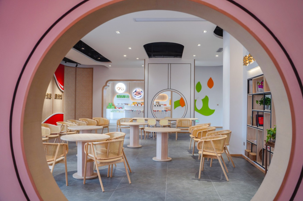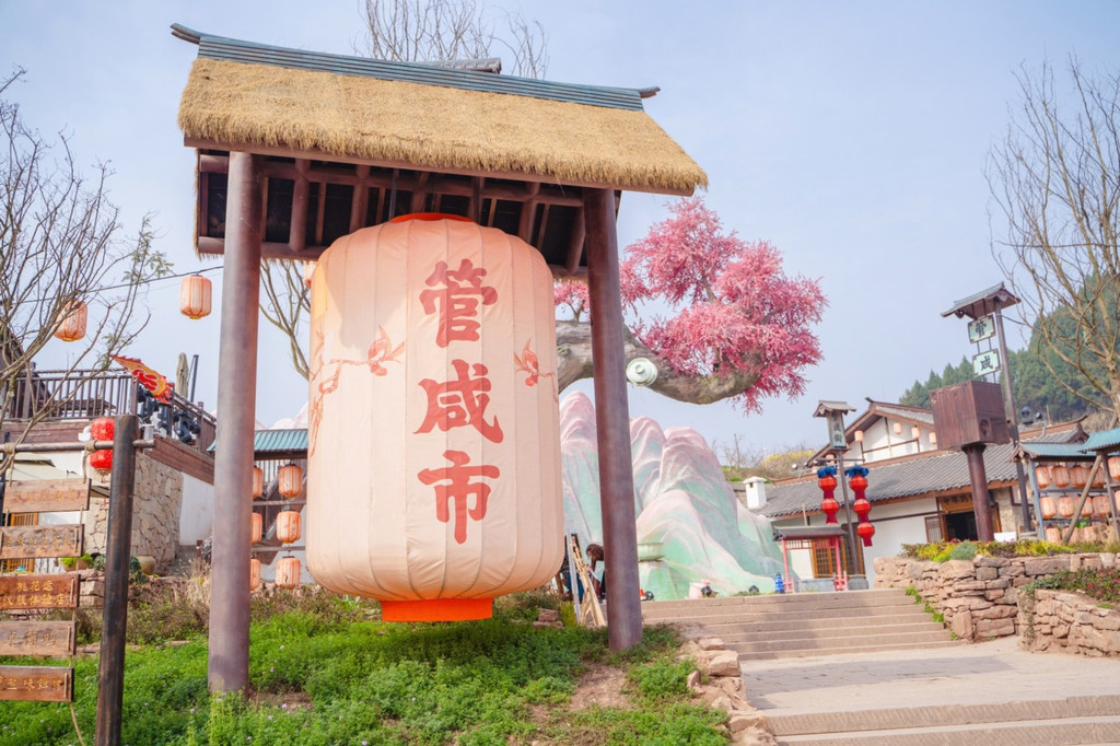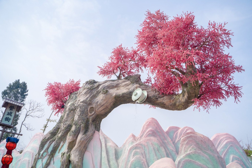 进入市集便能看到一棵千年桃树,设计的美轮美奂,像极了动漫中的场景。