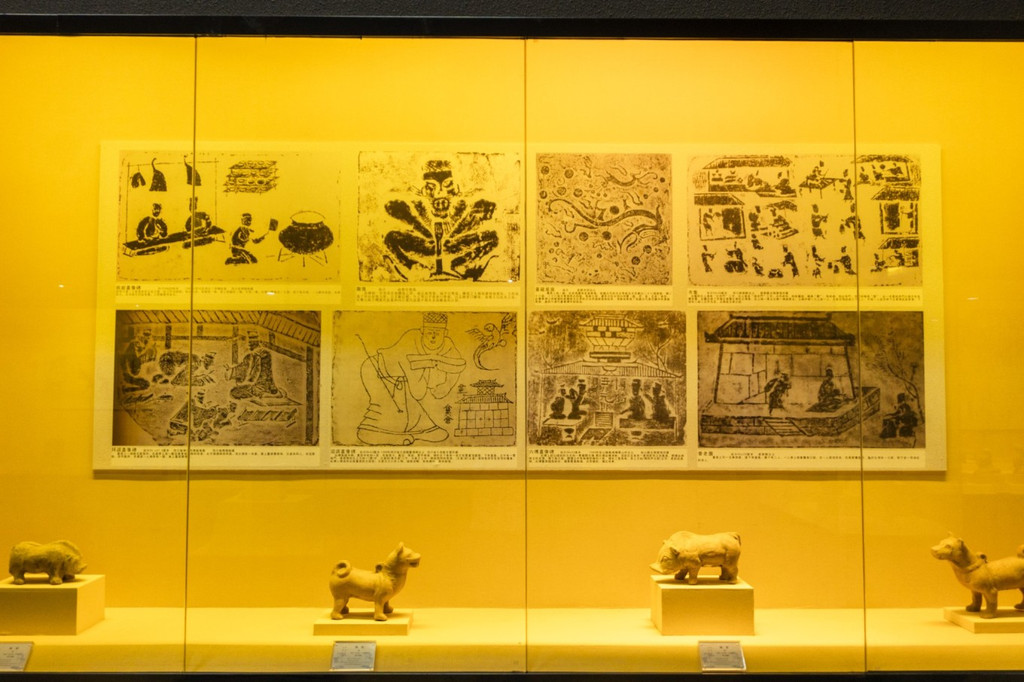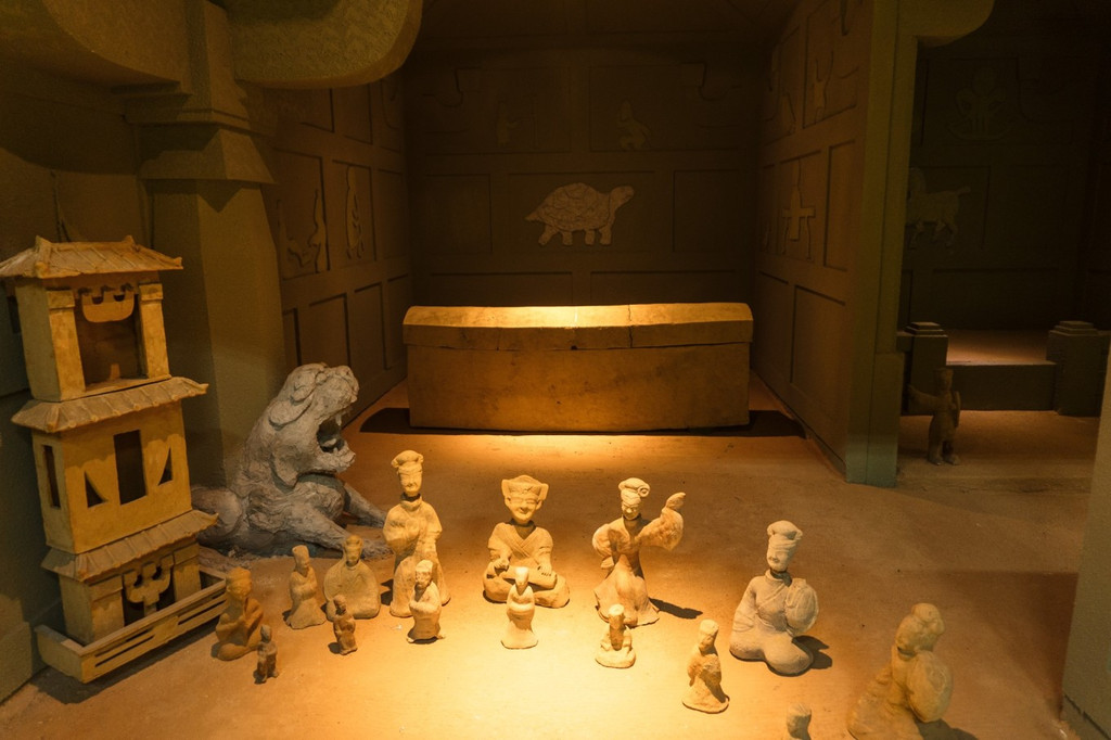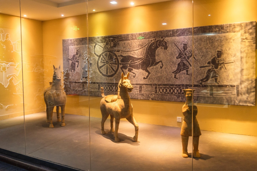 馆内的这个车马出行陶俑很精美,看着似驴非驴,和壁画上的一摸一样。原本还有一辆马车,可惜在地震的时候受到了损坏,目前还没有完全修复。