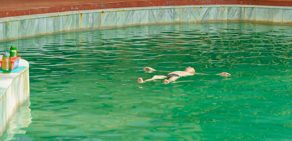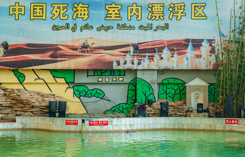 【中国死海】由来自地下三千多米深处、拥有1.5亿年历史的古盐湖海水形成,其含盐量达到了22%及以上,丰富的盐度让池中水产生来巨大的浮力,不会游泳的人也能在水上自由漂浮起来,就像图中这大哥一样,躺着睡觉都行,与中东死海是一样的效果~