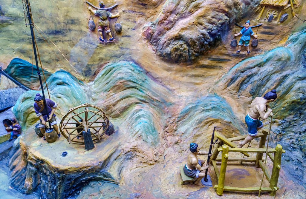 【卓筒井】并不是特指某一个景点,而是大英县境内41口古井的统称,这种手工制盐的活化石,发明于北宋庆历年间,距今已有1000年历史,比西方早了800多年,它是用直立粗大的竹筒来吸地下深处的卤水,然后再熬制得盐,其口径仅有竹筒大小,却能往下打井深达上百米,有“中国古代第五大发明、世界石油钻井之父”的美誉。