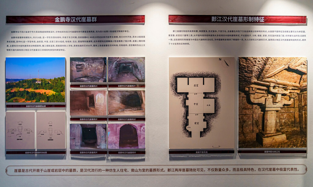 【大英汉陶博物馆】地处郪江流域,展出的文物也大多出土于郪江两岸,目前共有展区六处、文物905件,“西王母座神灯”是其中的镇馆之宝。但我更感兴趣的其实是“古墓复原展区”,这里通过等比例复制了东汉崖墓,十分清晰地展示了二千多年前崖墓的形制,清晰体现了郪国人“面水而居,依山而葬”的丧葬习俗,而墓室的简陋与豪华也是该时期等级制度的真实体现,也算是另一种方式去了解那个时代的文明。