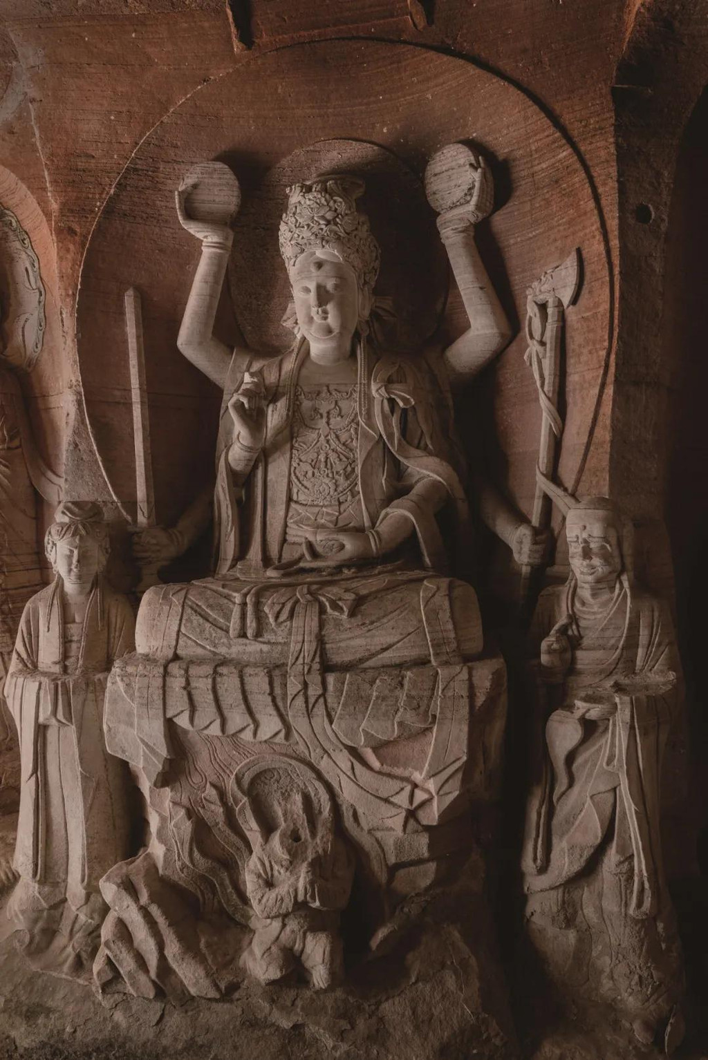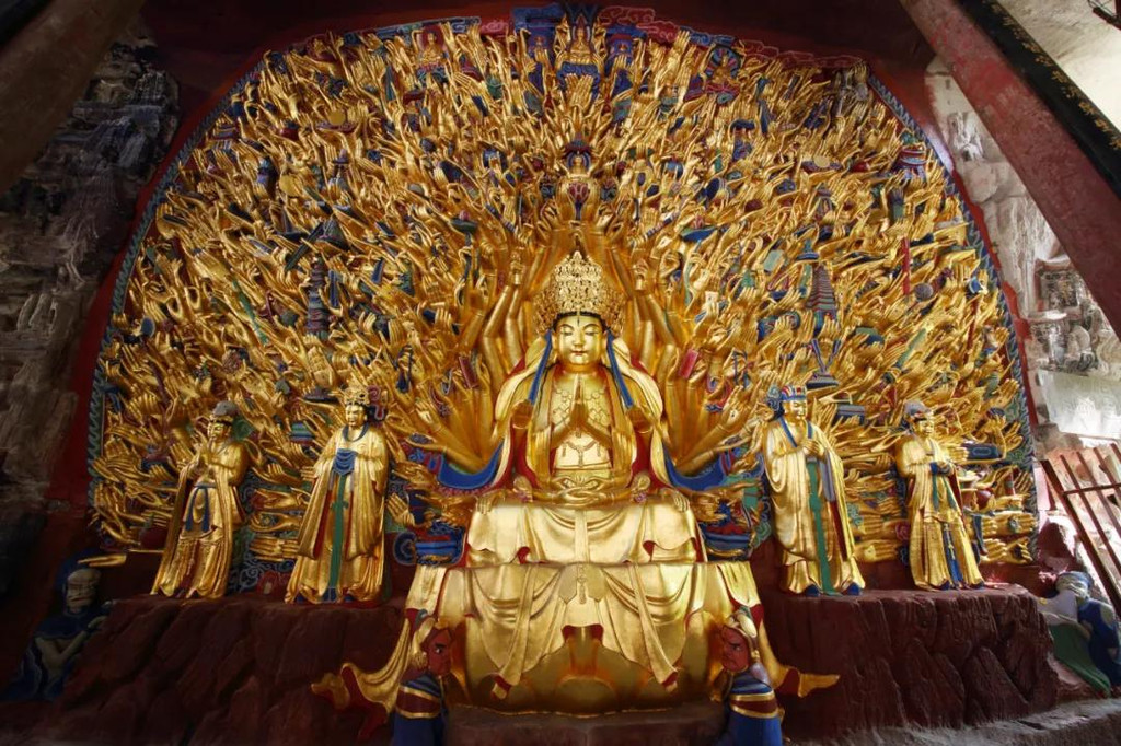 最为繁复艳美的千手观音,雕刻面积达到了88平方米,背后崖面上共雕有830只手、眼,集雕塑、彩绘、贴金于一身,足具堂皇,却因经历过多年的风雨,导致其被岁月侵蚀严重,出现了不同程度的风化现象,脸部及手部的石质,都有些变成了石渣与石屑纷纷掉落。
