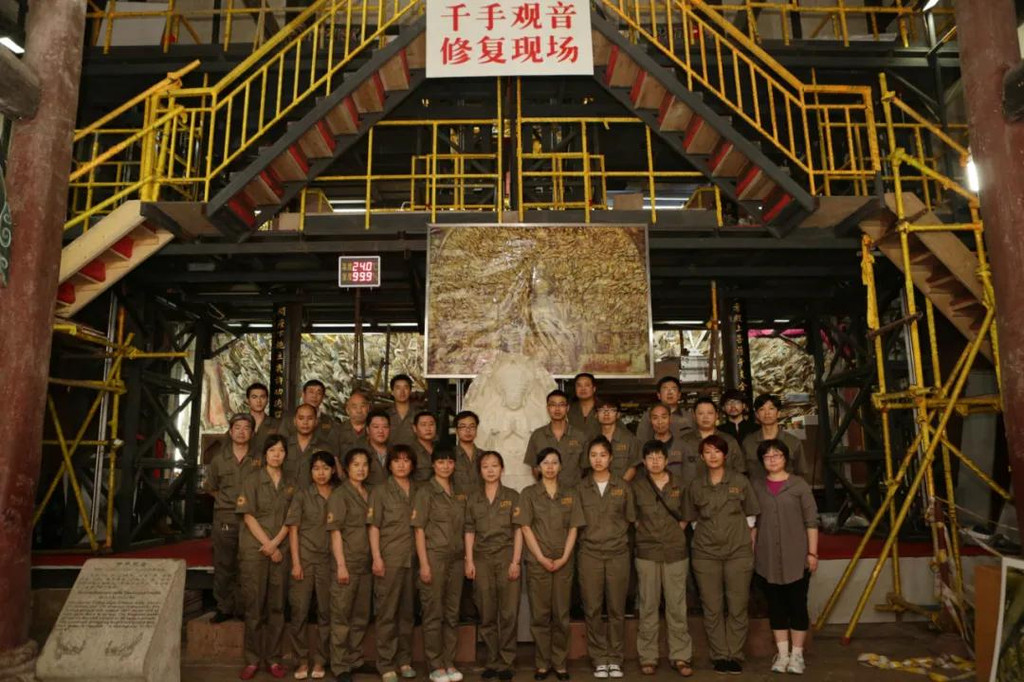 2011年4月,千手观音开始启动全方位修复,思路是:先治本,即在不损坏表面金箔的前提下,加固严重风化的岩体;后治表,包括金箔回贴、彩绘复原、缺失部位补型等程序。