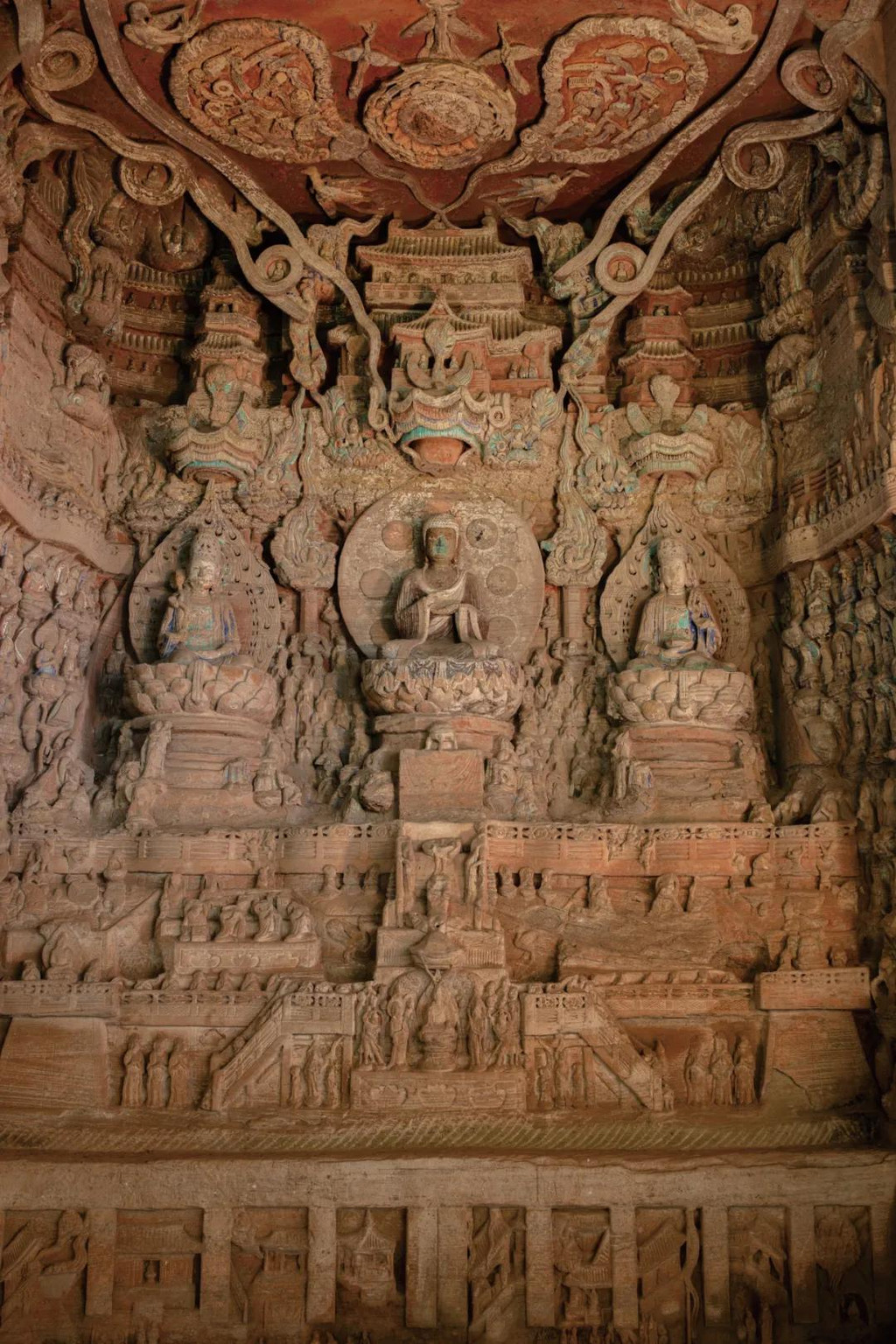 从唐走向宋,越发华丽。宋时造像中,所有的禽鸟都在欢舞,繁花卷成层层叠叠的图案。第245号观无量寿佛经变相,人物造像539身,各种器物460余件,那些伎乐天人,亭台楼阁,一件件既不呆板也不重复,融合得浑然一体,热闹而生气勃勃。