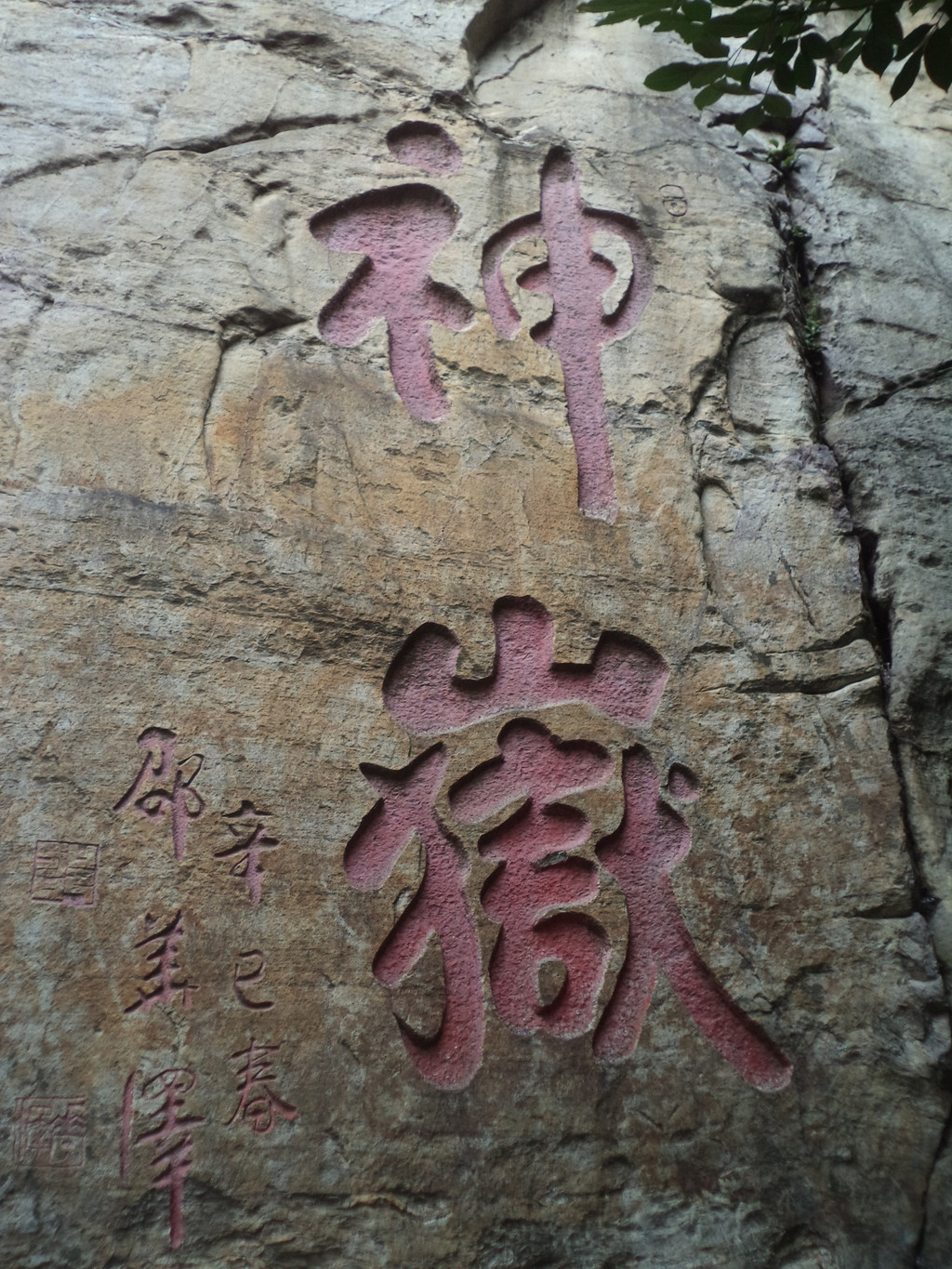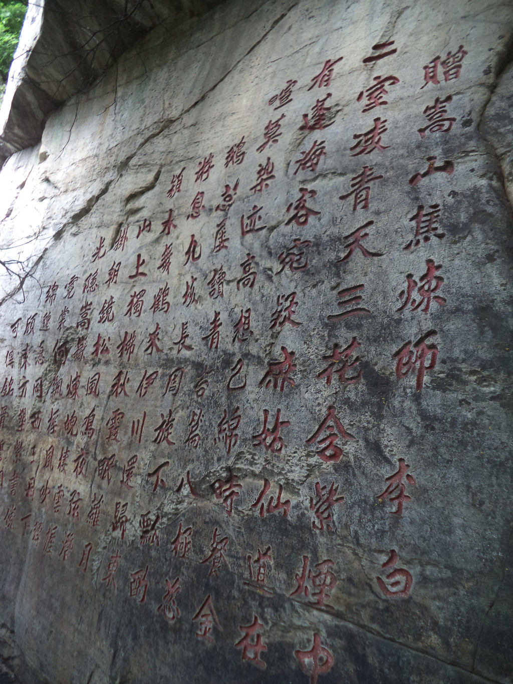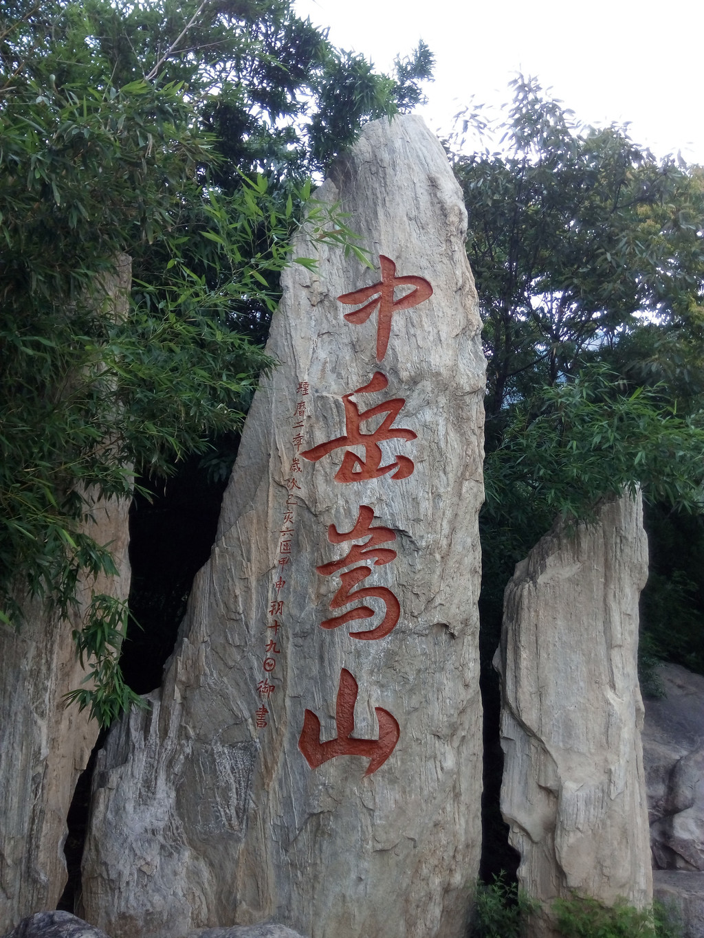 再往前不远又见一景,路旁岩石上刻着“神岳”两个大字,右边是李白《赠嵩山焦炼师》诗的摩崖石刻,头两句是“二室凌青天,三花含紫烟”,看来李白也登过嵩山,诗中的焦炼师是一位著名的女道士,李白因造访她而登嵩山,但未寻到其人,所以写此诗遥寄给她。其实李白还写过不少与嵩山有关的诗,如《送裴十八图南归嵩山》、《送杨山人归嵩山》等,看来他在嵩山有不少好友。
