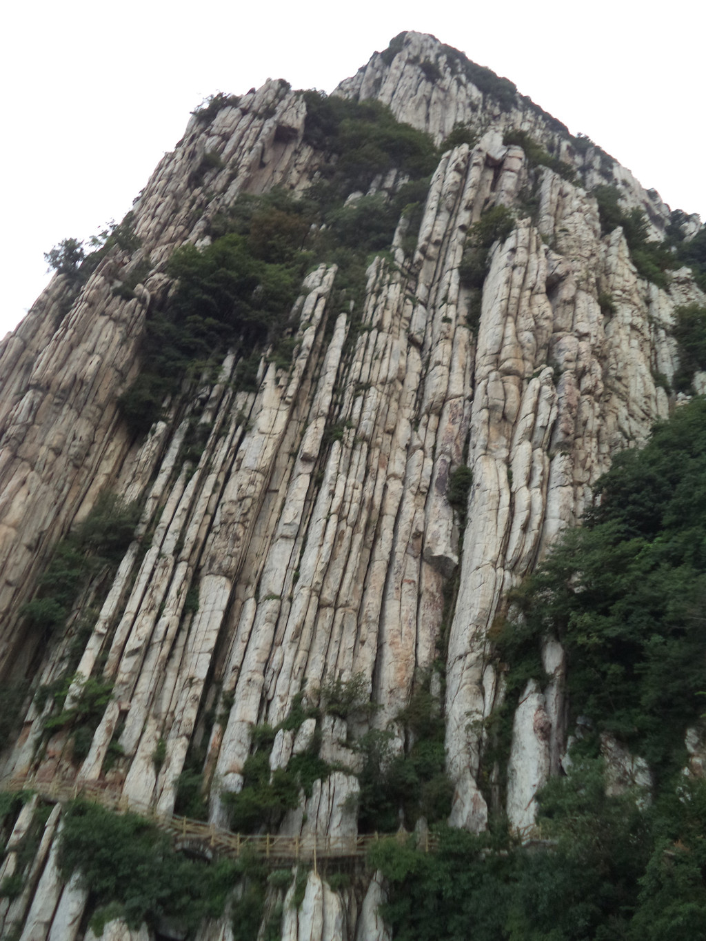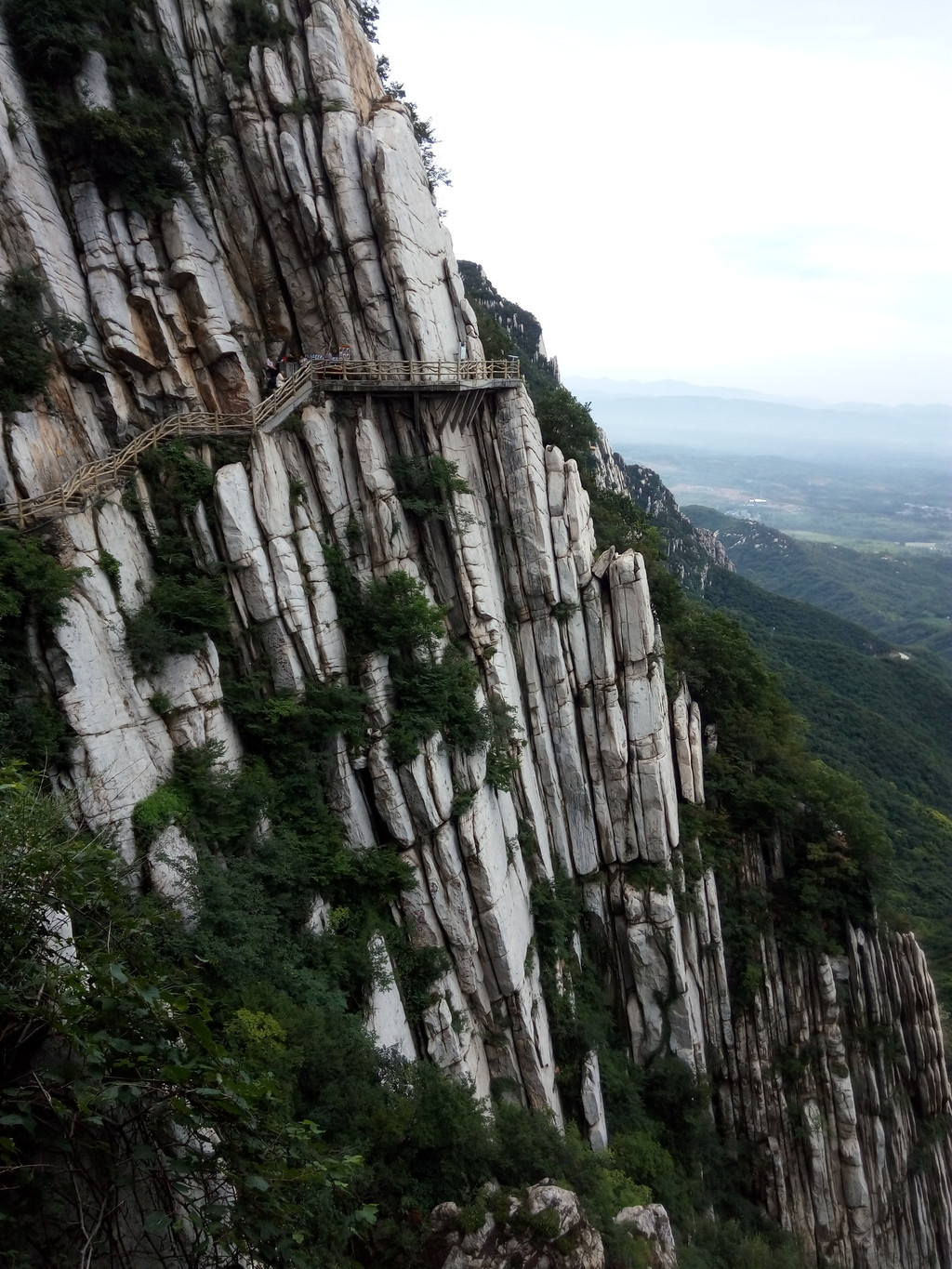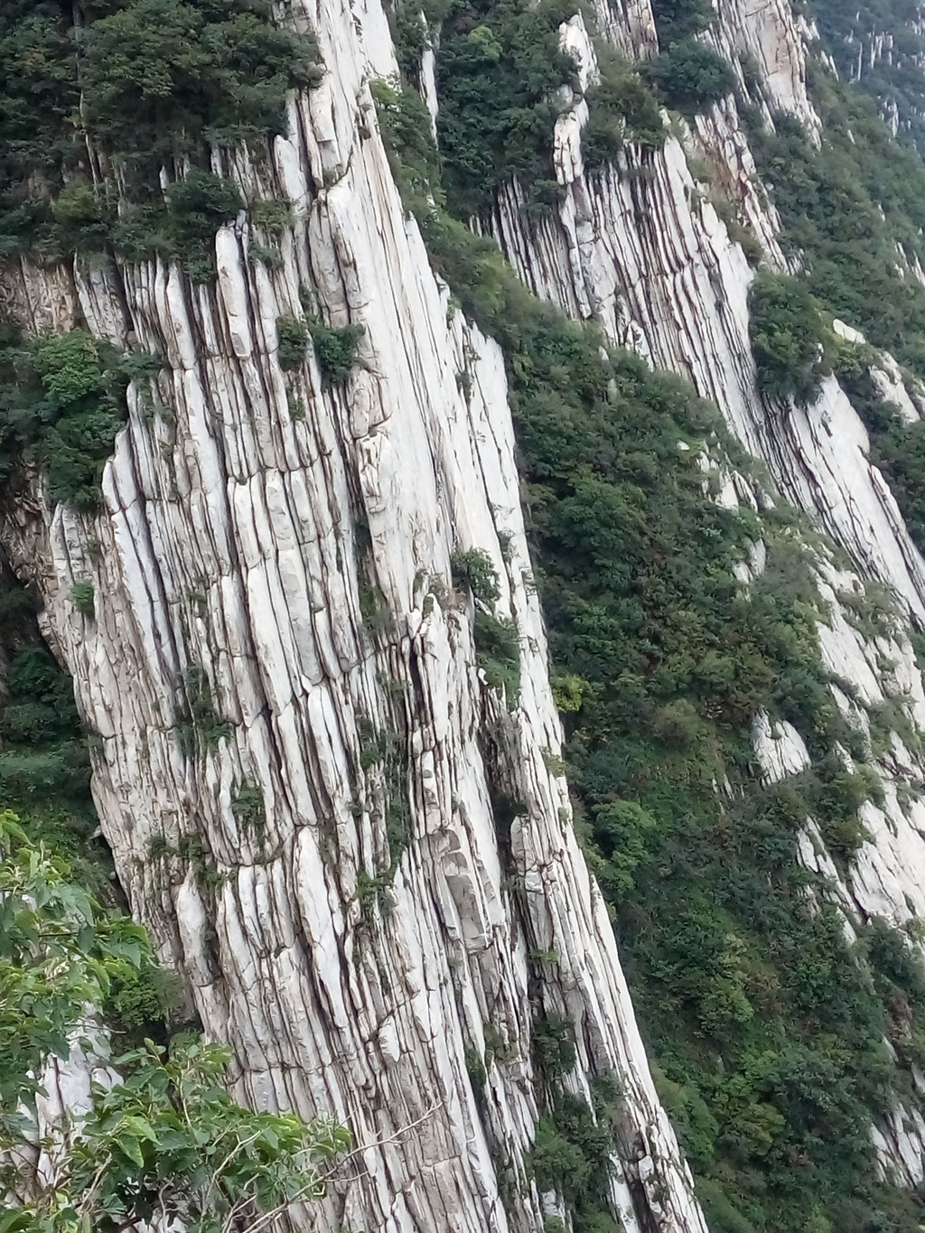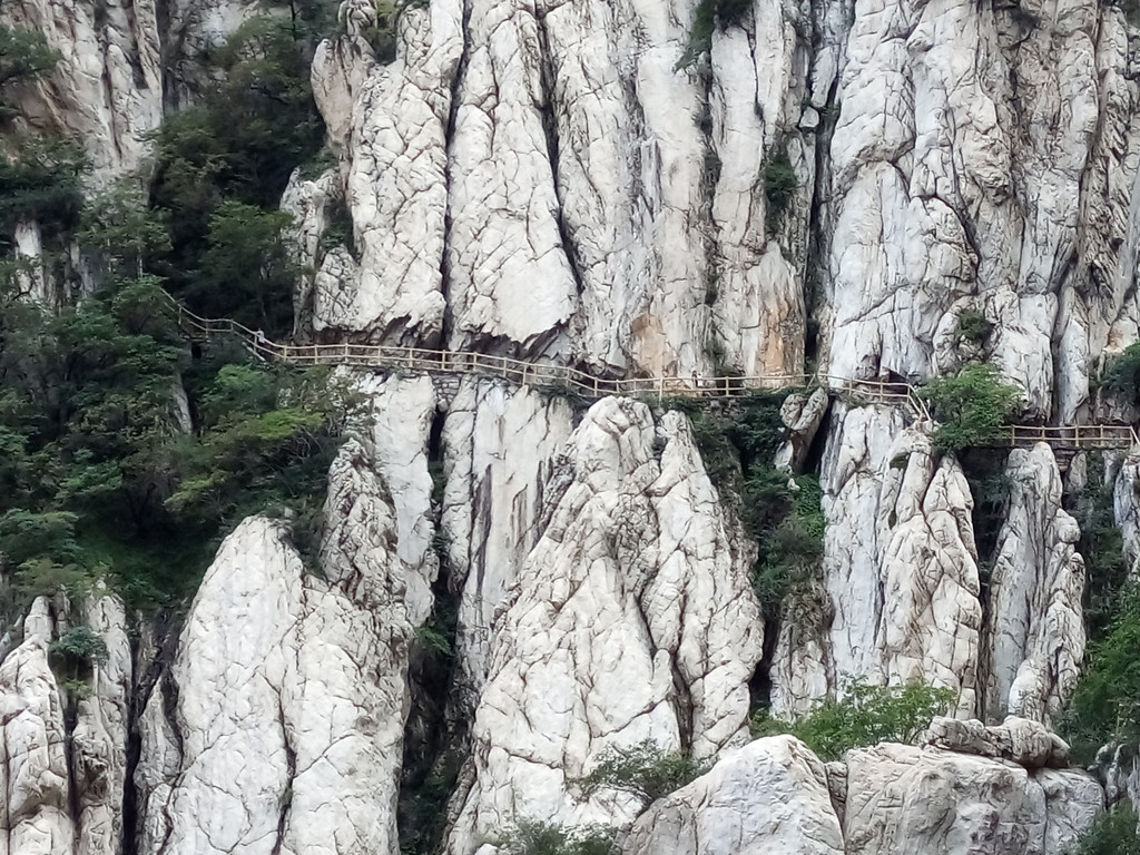 大约走一里多路便看到著名的书册崖,这是少室山标志性景观,片片长岩就象一排斜立的书册,上顶青天,下插深谷,这就是18亿年前中岳运动的产物,嵩山地区第二次成为陆地,原本近水平状的岩层经强烈的造山运动后变成斜立状,铸造出少室山的这般奇景,而悬空栈道就架在半山石壁之中,不断向前延伸,
