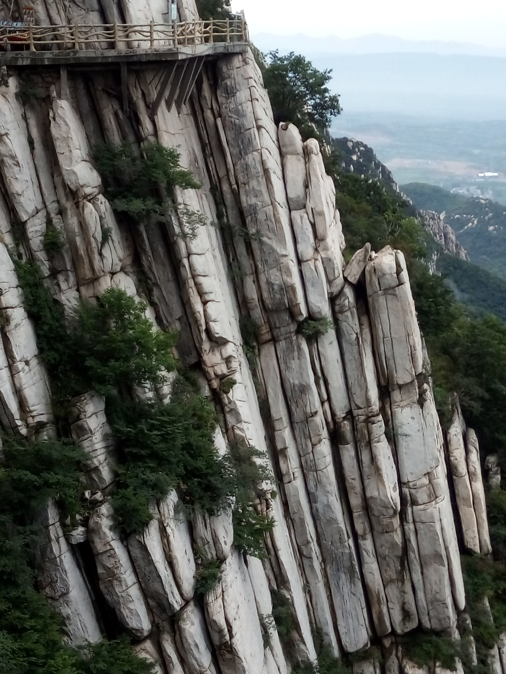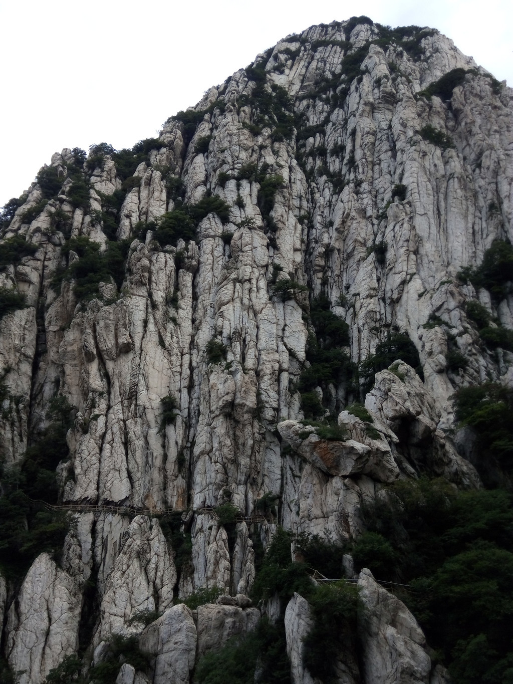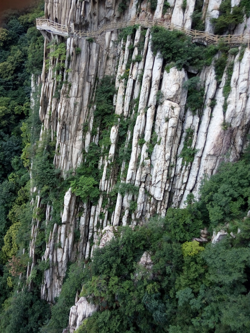 大约走一里多路便看到著名的书册崖,这是少室山标志性景观,片片长岩就象一排斜立的书册,上顶青天,下插深谷,这就是18亿年前中岳运动的产物,嵩山地区第二次成为陆地,原本近水平状的岩层经强烈的造山运动后变成斜立状,铸造出少室山的这般奇景,而悬空栈道就架在半山石壁之中,不断向前延伸,