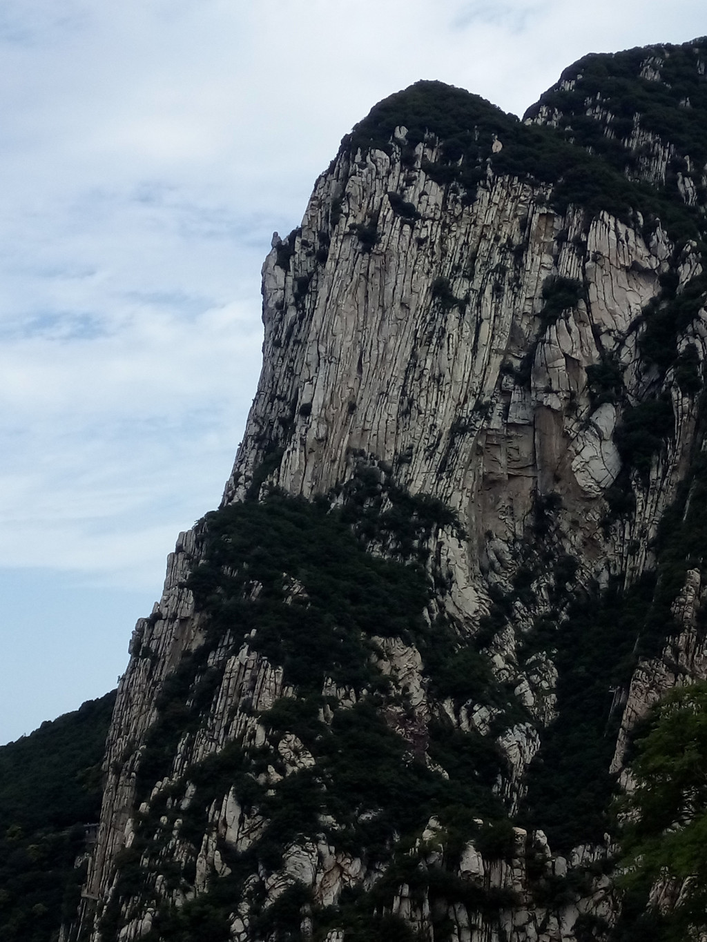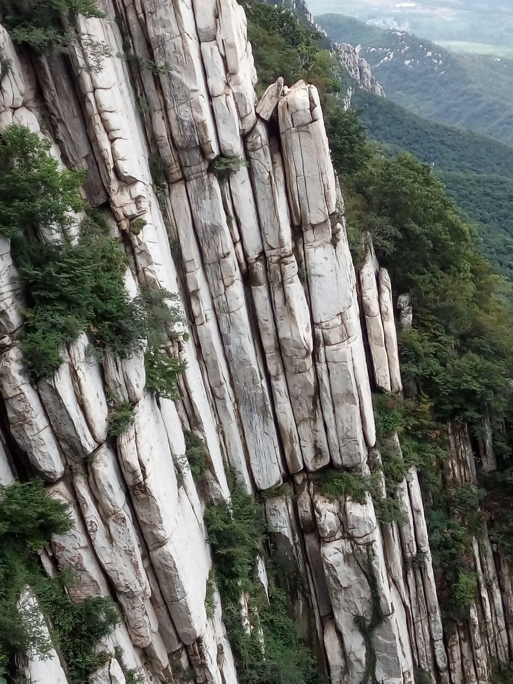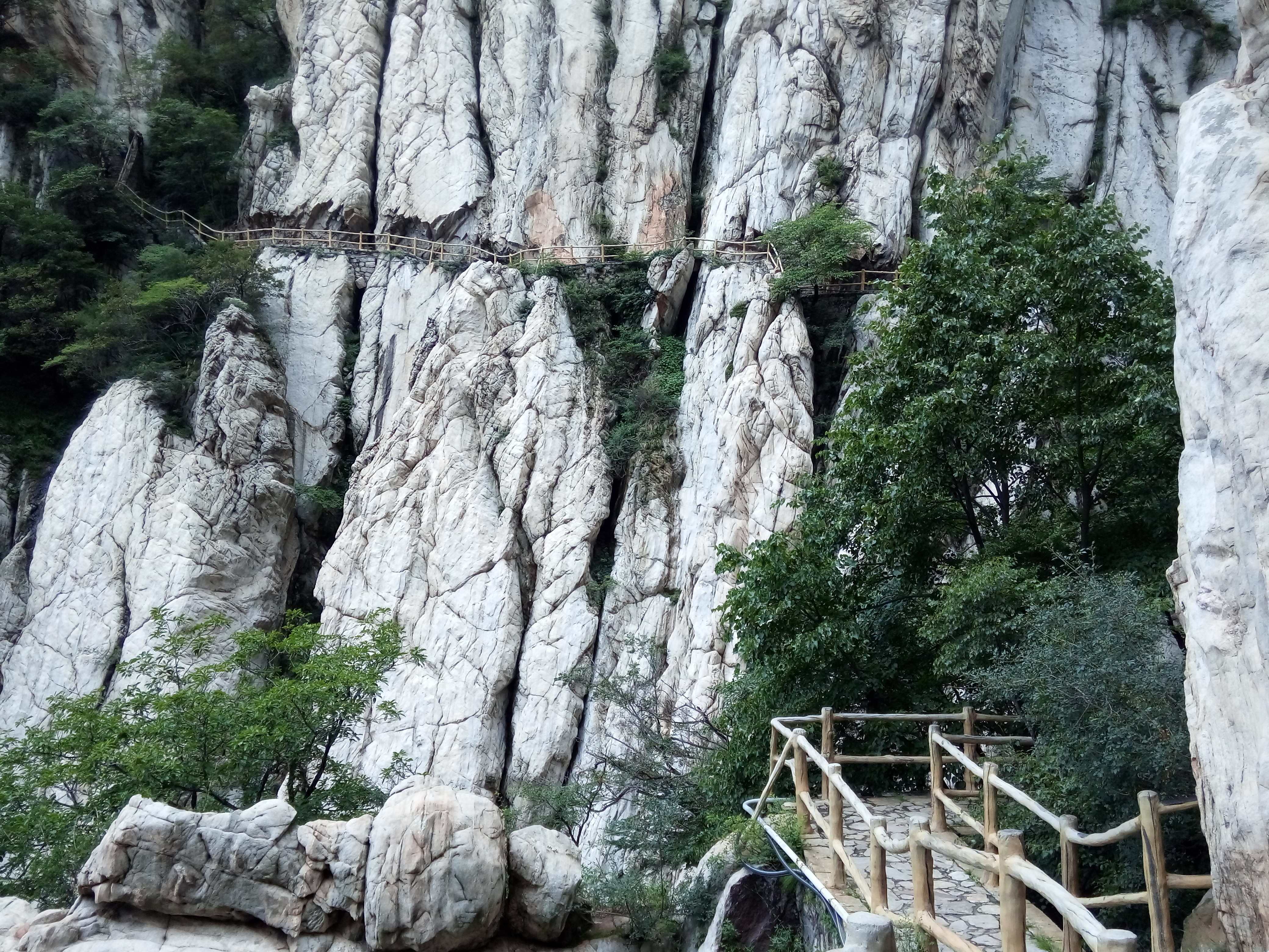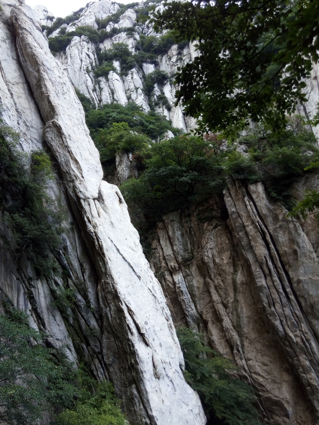大约走一里多路便看到著名的书册崖,这是少室山标志性景观,片片长岩就象一排斜立的书册,上顶青天,下插深谷,这就是18亿年前中岳运动的产物,嵩山地区第二次成为陆地,原本近水平状的岩层经强烈的造山运动后变成斜立状,铸造出少室山的这般奇景,而悬空栈道就架在半山石壁之中,不断向前延伸,