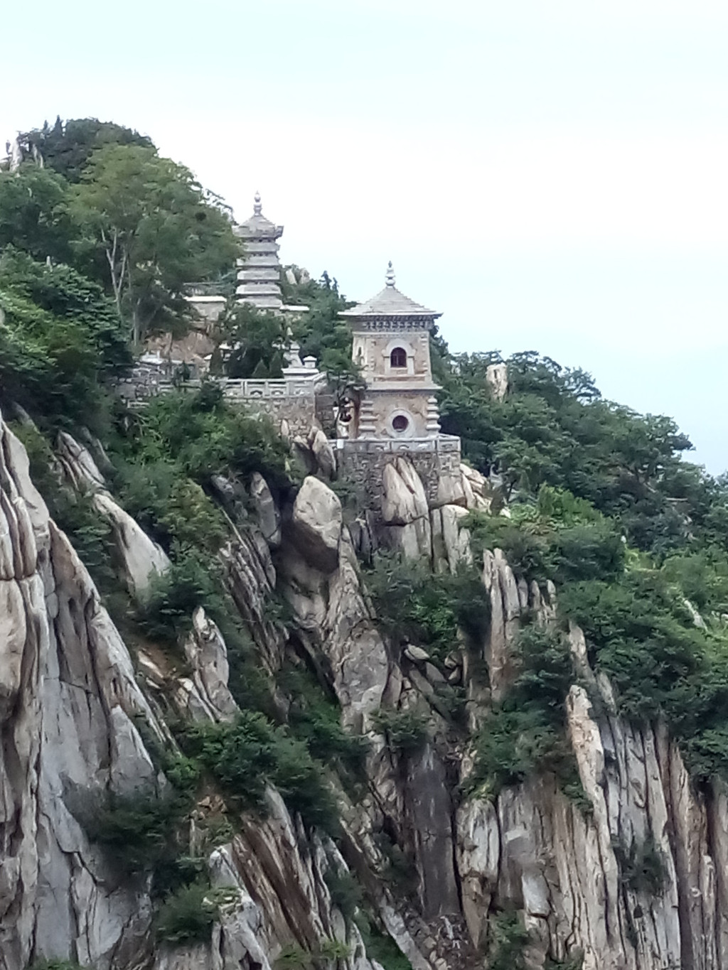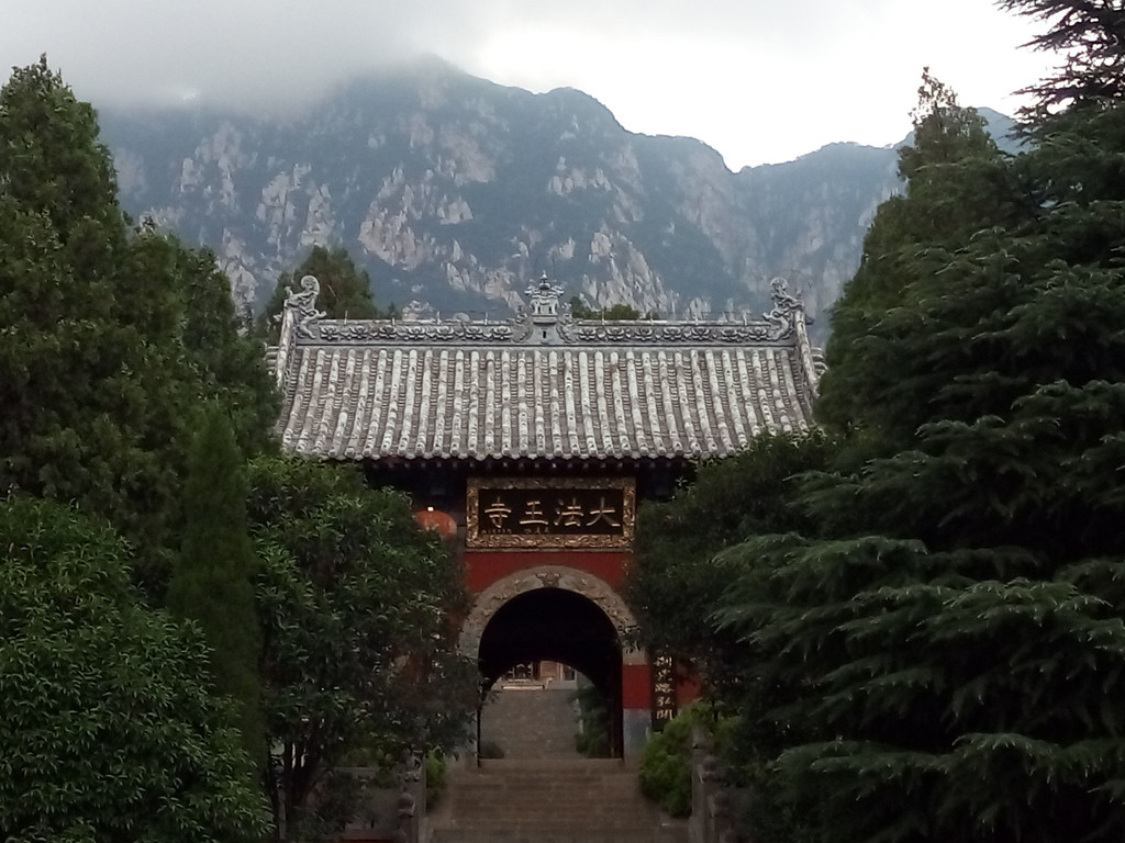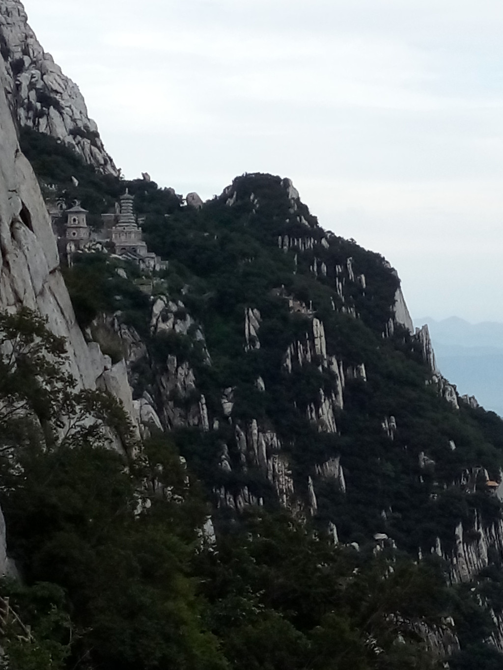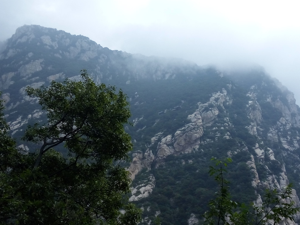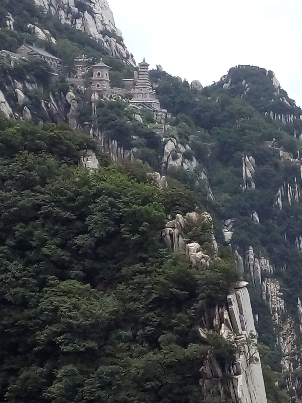 我们进检票口开始向上攀登,山势渐陡,途中过老母宫、峻极宫,都在维修不开放,一路上林木遮天蔽日,我们走了1小时仍不见太室山的真面目,到聚仙亭后登上二层才看到附近的山峰。