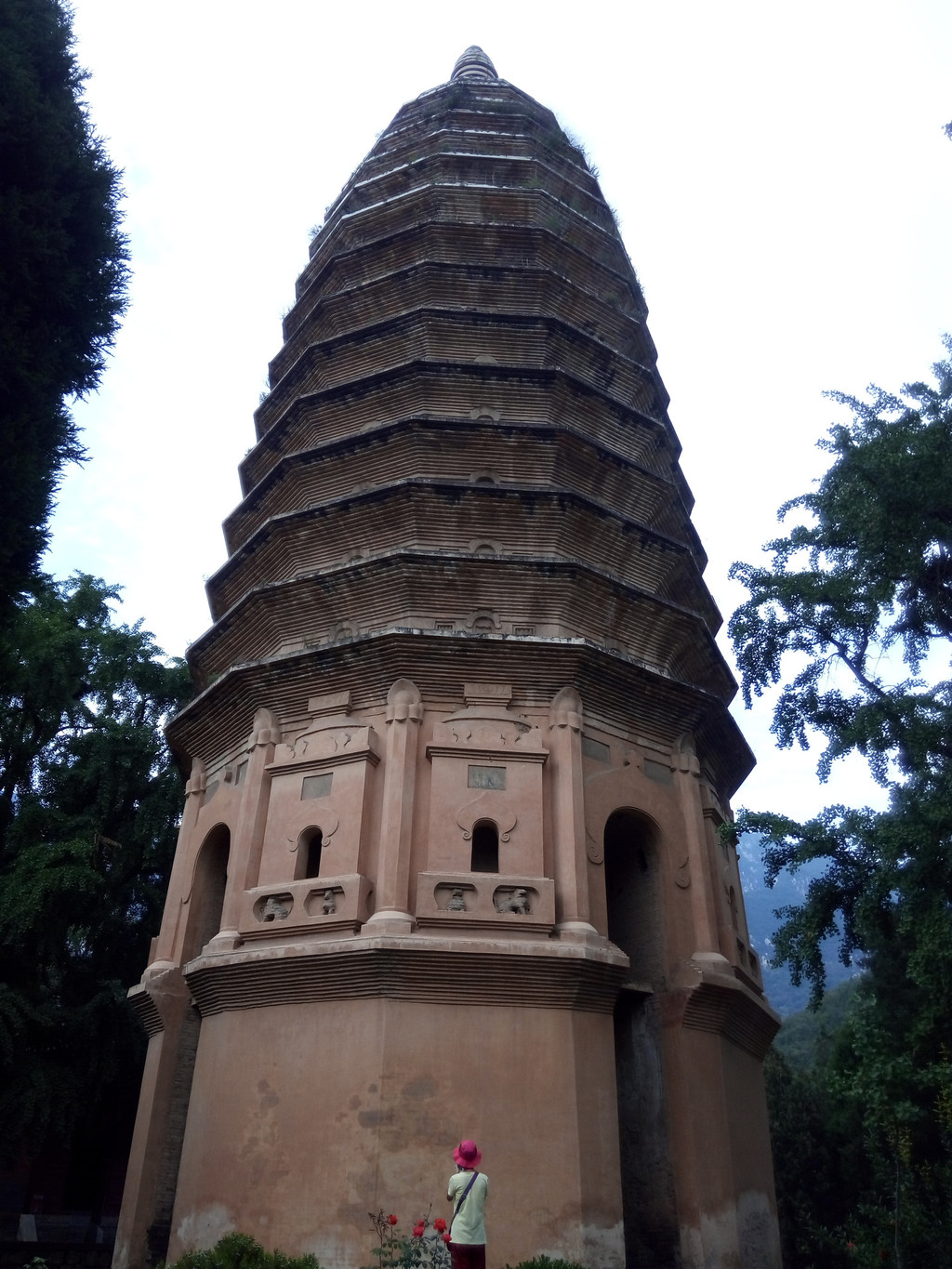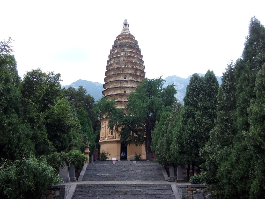 嵩岳寺始建于北魏永平二年(公元509年),原为北魏宣武帝的离宫,后来崇尚佛教的孝明帝将其改成了寺院,并在寺内建造了嵩岳寺塔及千余间佛殿,武则天和高宗游嵩山时曾把嵩岳寺改作行宫,金元以后嵩岳寺逐渐衰落,现在塔前的山门和塔后的大雄宝殿及两侧的伽蓝殿、白衣殿均为近代改建,我们来此也不是看寺而是看塔。现在的嵩岳寺并不大,建筑也没有几幢,一进门就看到位于正中通体黄色的嵩岳寺塔,