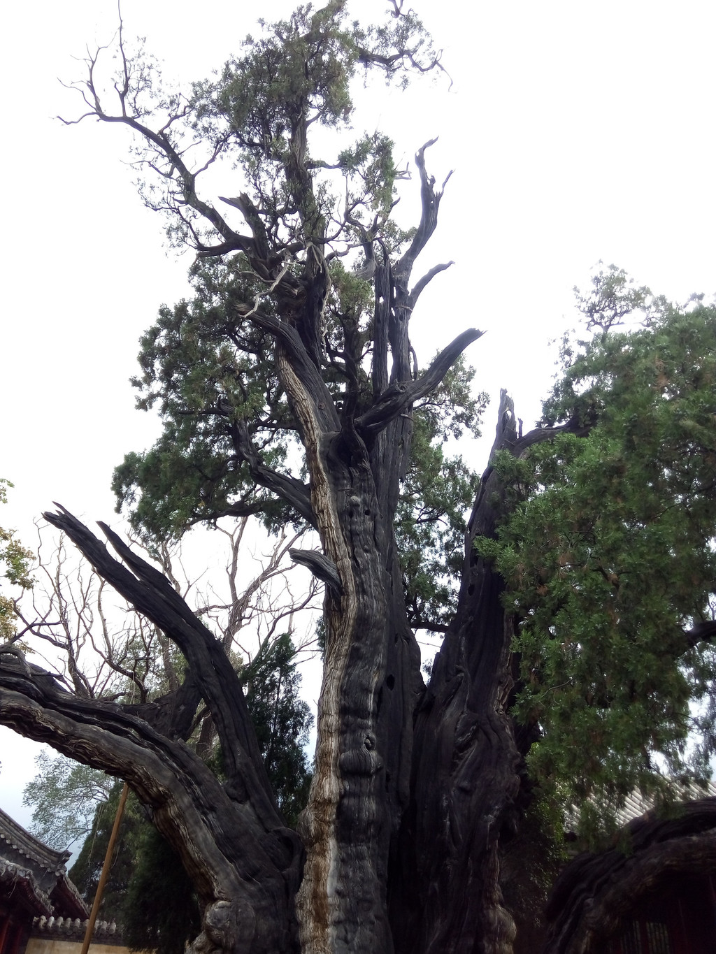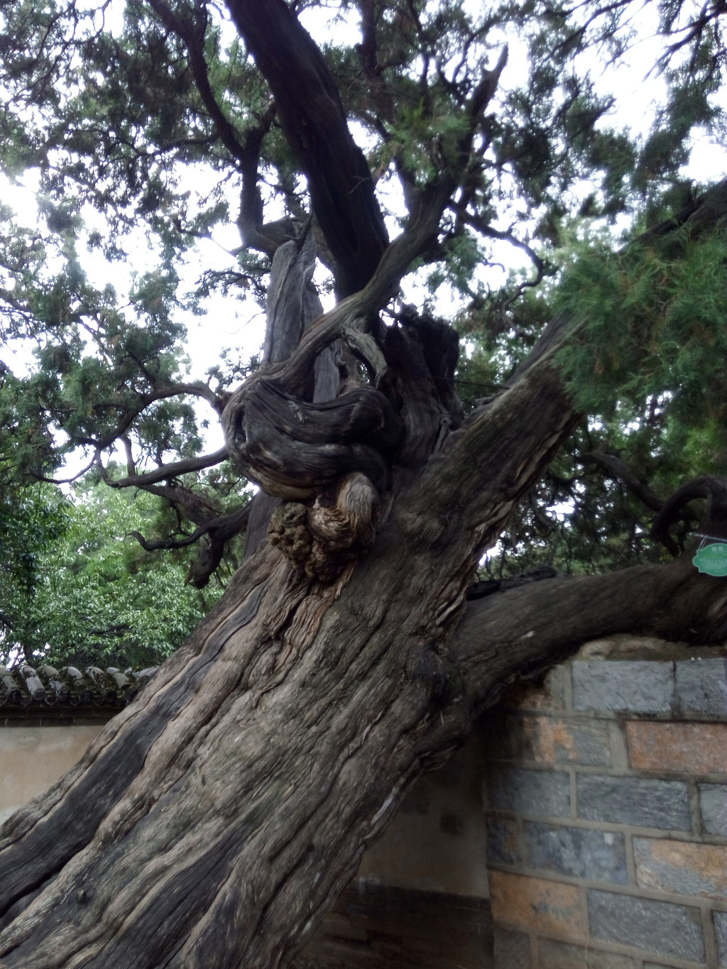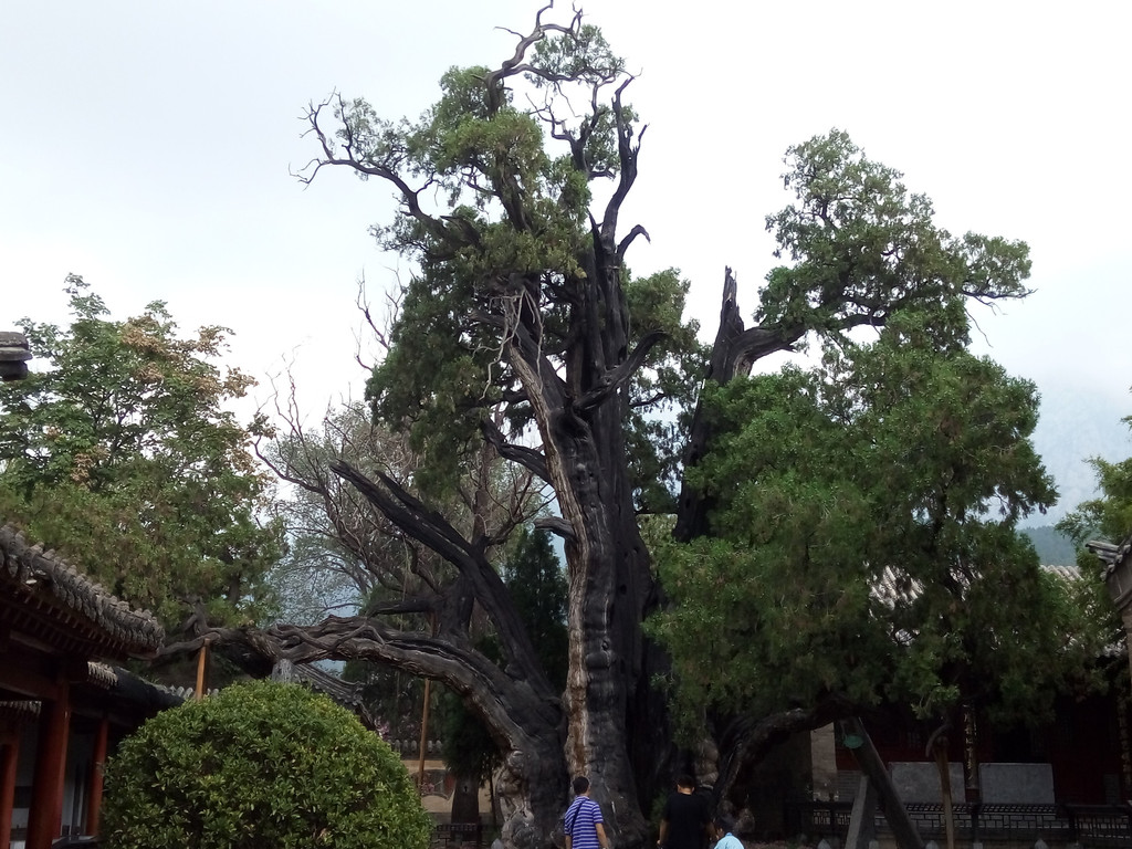 当然最吸引我们是将军柏,原有3株,西汉元封六年(公元前110年),汉武帝刘彻游嵩山时,见柏树高大茂盛,遂封为“大将军”,“二将军”和“三将军”,其中三将军柏毁于明末,现仅存2株,大将军柏树高12米,围粗5.4米,树身斜卧;二将军柏树高18.2米,围粗12.54米,虽然树皮斑驳,老态龙钟,却生机旺盛,虬枝挺拔。关于将军柏树龄一直是个神秘的话题,赵朴初留有“嵩阳有周柏,阅世三千岁”的赞美诗句,估计这2棵柏树的树龄可追溯到周代,经林学专家鉴定,将军柏为树龄有4500年,是我国现存最古、最大的柏树。我们进去后先看到左右开枝的二将军,两根弯曲如翼、左右伸张的庞然大枝,形若雄鹰展翅,但树身主干已空,形成的树洞中可容五、六人,而大将军则藏在角落,树身竟斜伏在墙上,但两树挂的树龄牌却显示为2100多年,我认为这只是汉武帝封柏的时间,不是树龄,除非当时树刚种下。细心的游人会发现一个奇怪的现象,二将军柏比大将军柏大得多,为什么被封为第二呢?民间传说汉武帝首先看到一株大柏树,便信口封为“大将军”,尔后看到了更大的一棵,但天子金口玉言不能更改,只好让大的屈居第二,再往里走又看到最大的一棵,只好说:“再大你也是三将军了”。