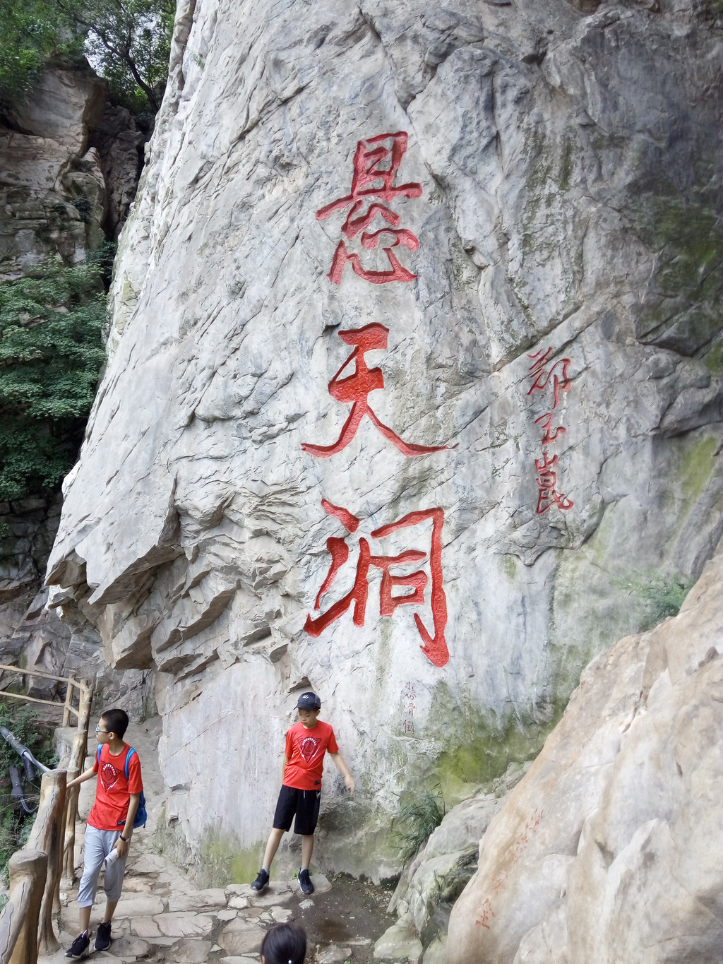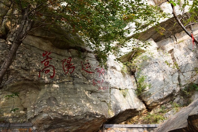 在亭中休息后最后冲刺,景观很快开始出现,首先看到路边石壁上“嵩阳运动”4个大字,路边一牌详细介绍了有关情况,嵩阳运动由中国科学家张伯声院士于1951年在此发现并命名,这里保留有23亿年前嵩山第一次地壳运动的遗迹,嵩阳运动的地质遗迹界面是划分太古与远古的界限,也是研究地球演化历史的重要场所,国内独有,世界罕见所以“嵩阳运动”4字也是张伯声本人笔迹,这比由书法家来题更有意义。