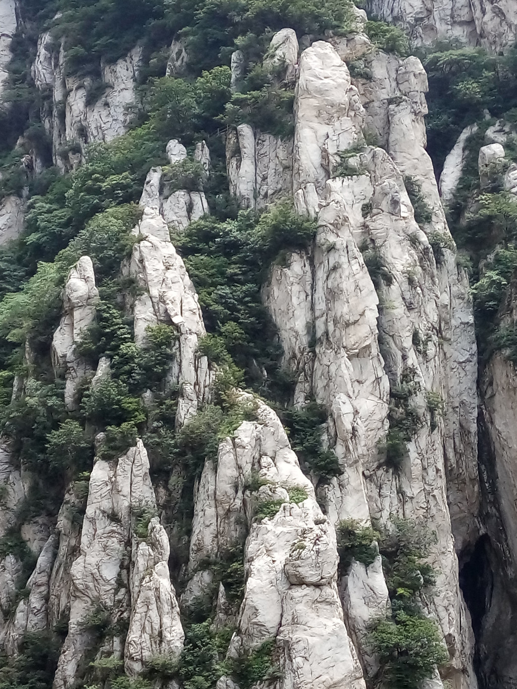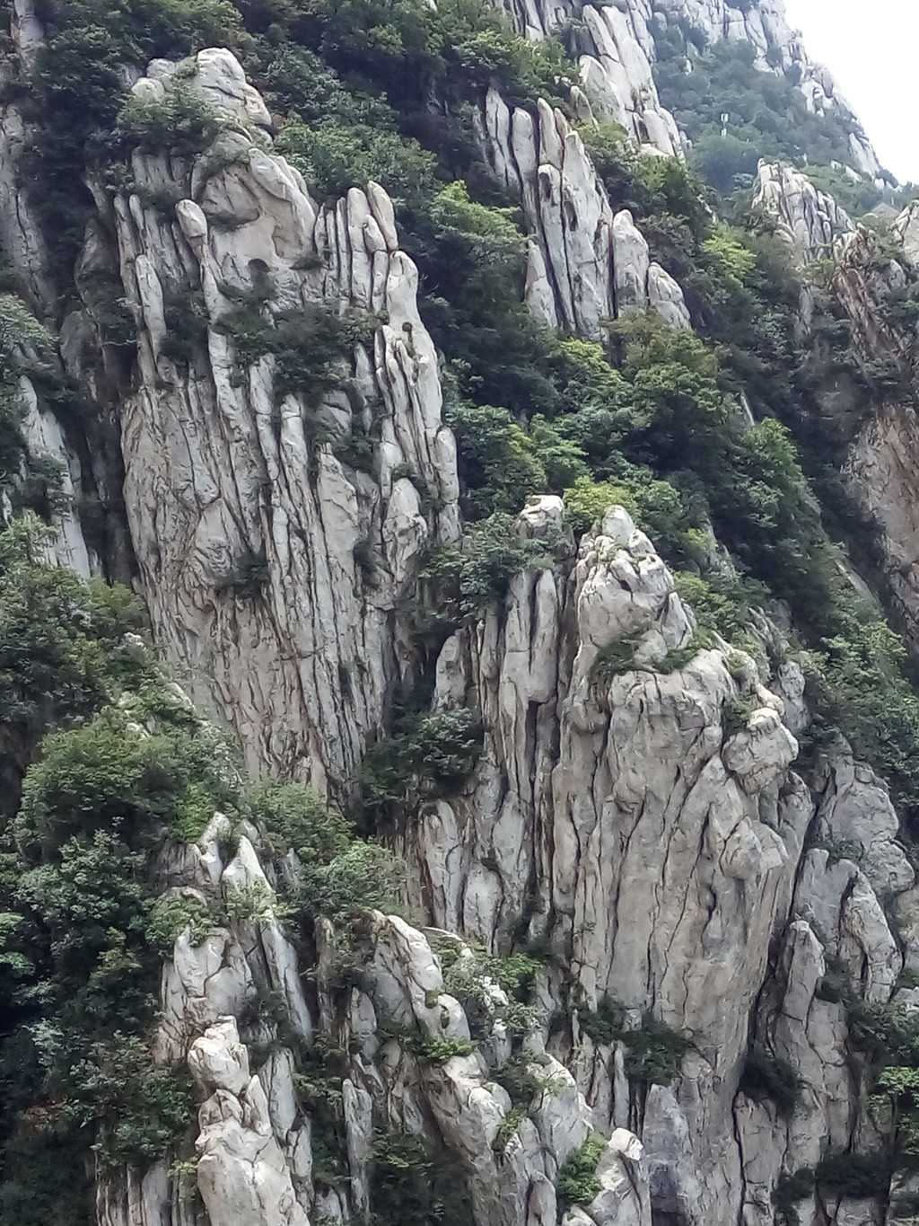 登少室山的主峰连天峰只有土路可上,除非探险一般无人登顶,大部分人的走法是进少林景区坐电瓶车到终点塔林,再乘少林索道上山,然后才开始步行一路向南。上午我们起了大早,7点刚过就出酒店大门了,直接打的到少林景区,从索道上站至南出口全程约5公里,但我们计划走到三皇寨返回,因为徐霞客有诗云:“嵩山天下奥,少室险奇特,不到三皇寨,不算少林客”,而《河南旅游手册》说:三皇寨是嵩山最有代表性的景区之一、嵩山国家森林公园和地质公园的核心。搜狗百科称三皇寨生态自然环境、地质地貌独具一格,以峰奇、路险、石怪、景秀而著称天下, 网友们也对其推崇备致,纷纷认为嵩山最好的景致在三皇寨,但有位网友在游记中将少林索道口至三皇寨这段距离标为1公里,使我误以为少室山行程轻松,下缆车开始步行时的确道路平坦,坡度也不大,我认为少室山的景色远超太室山,一路所见的各种岩石形态奇特、千姿百态,尤其是呈片状斜立的条岩层层叠叠,有的甚至极其单薄,最长的竟达百米,全景无法收入镜头,我不禁惊叹天地造化和大自然的鬼斧神工。