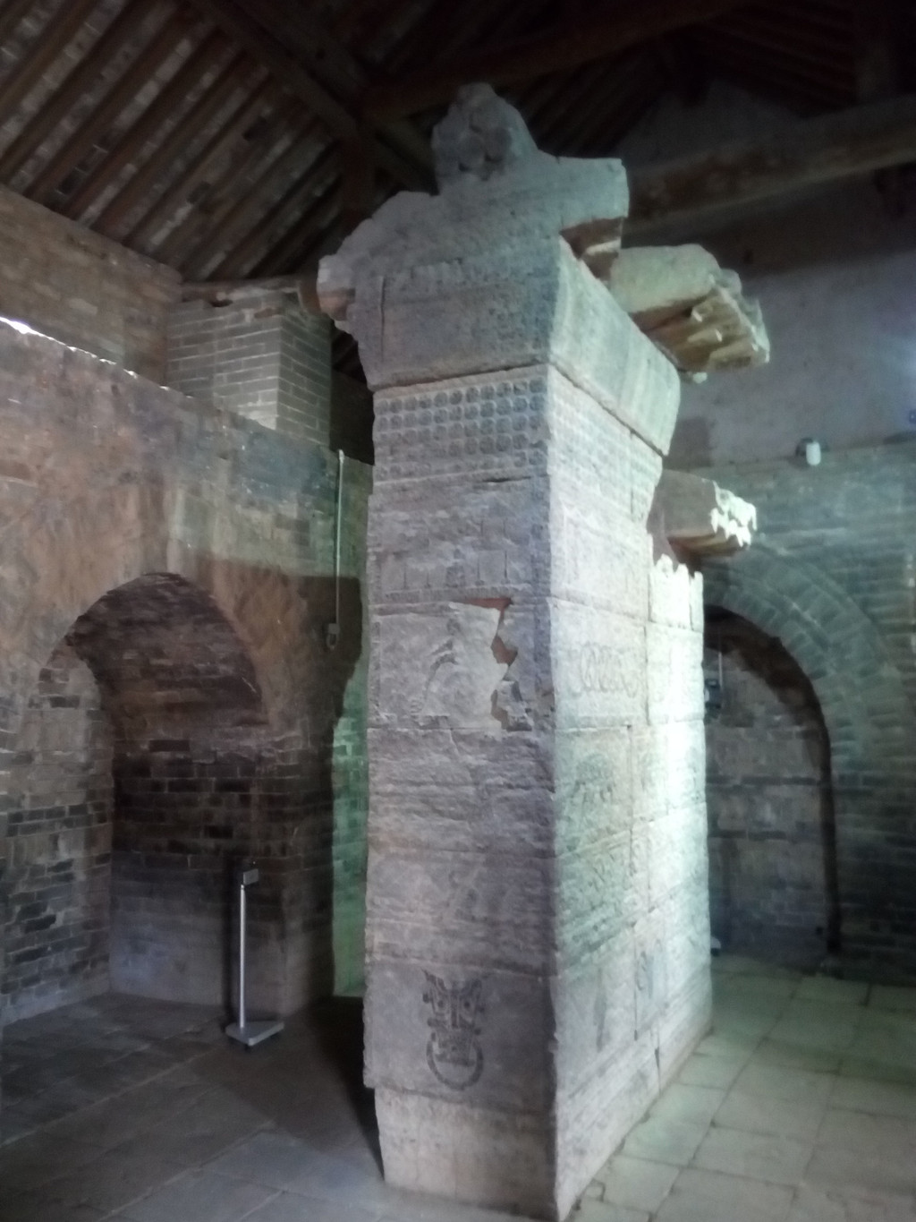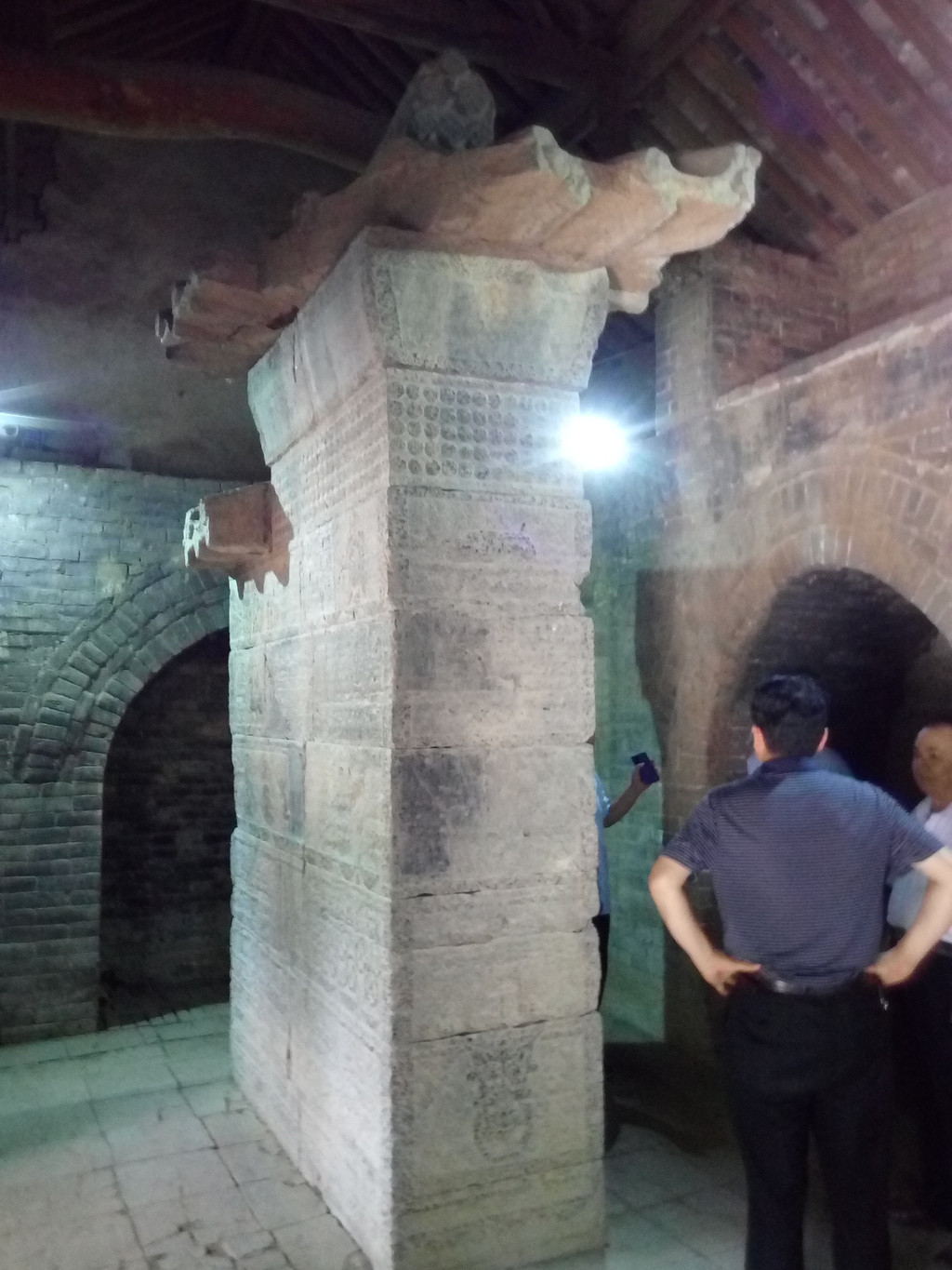 但门口两侧四角亭内的翁仲石像引起我的关注,说明牌称其也是雕造于东汉元初五年(公元118元),应与太室阙同期设立,与太室阙均为太室祠神道的组成部分,石像体形粗犷原始,人体线条不明显,身高仅1.2米,再联系太室阙的间距和高度,可以想象汉代建筑的简朴,并不像现在这么铺张。