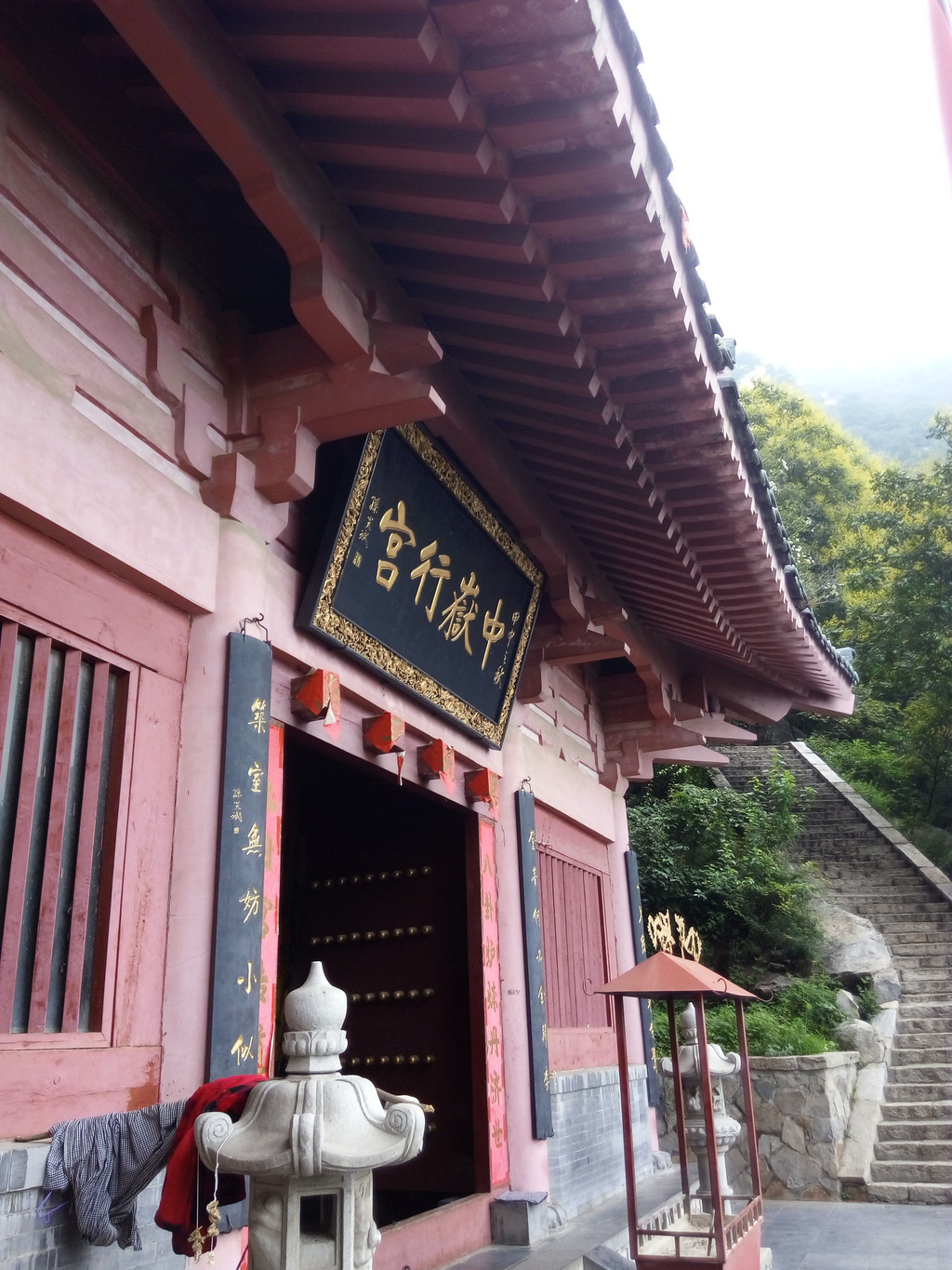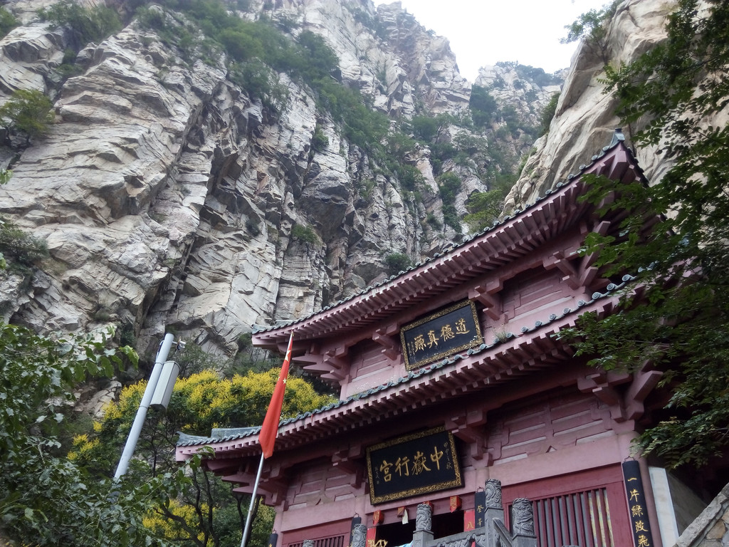 由此再向前百米就是中岳行宫,当地人俗称小中岳庙,据说是中岳大帝巡察时的行宫,建于何时无考,据宫内现存明嘉靖四十四年(公元1565年)重修碑记可知,明代中期时曾重修,因此判定该宫至少创建于明代中期,后又经多次修缮,但其建筑规模不大,看上去颜色也较新,建筑紧贴山体,背后悬崖危耸,乱岩咧嘴,