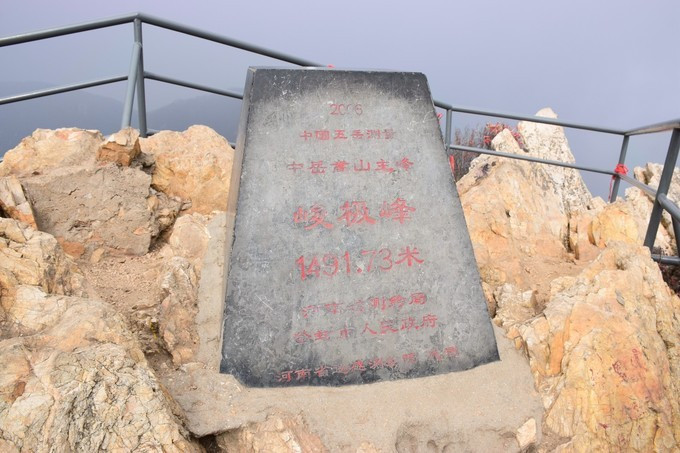 从山下至此我已走了2.6公里,超过登顶路程的5/6,从中岳行宫右侧的山道上峻极峰,路程虽然仅有500米,但海拔高度却急剧上升了近500米,其中到下一站的三皇口约100多米路均为大段的陡坡石阶,较难攀登,三皇口到峻极峰约360米路虽坡度较缓,但从网友拍摄的照片看,峰顶除海拔标志外并无其他景观(见下图),于是我们在看完中岳行宫后原路返回山下。