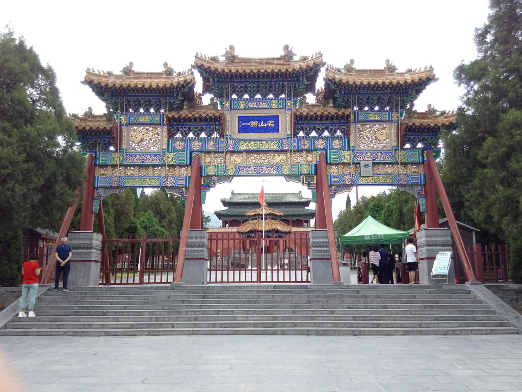 南面刻有“中岳太室阳城”六个篆字,西阙有隶篆参半的铭文,记述造阙的经过,上书“元初五年四月阳城□长左冯诩万年吕常始造作此石阙”等字,阙身四面刻着人物、车马出行、马技、剑舞以及动物等画像50余幅, 艺术风格浑朴古拙,气势深沉。离开太室阙,又回到中岳庙前,现在的中岳庙建筑多为清代重修,多年前我也已游览过,此次就不再进去了,