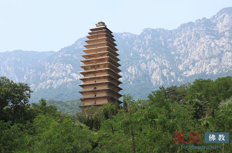 法王寺有公路可达门前,但我们到此不为拜佛烧香,而是专为寺后山的隋唐二塔而来。塔的建筑形式最早源于古代印度,原本为佛教建筑,多为5—7级,也有高至13级的,初用于佛教高僧埋骨,后来也用于藏经,汉代随佛教传入中国,原译为浮屠,隋唐时翻译家才创造出了“塔”字作为统一的译名,其中密檐式塔为唐代、辽代佛塔主要类型之一,始于东汉,盛于隋唐,其第一层很高大,以上各层的层高很小,塔檐紧密重叠,塔身平面多为四角形、六角形和八角形。法王寺1号的舍利塔,建于隋仁寿二年(公元602年),是中国著名的古塔之一,也是隋唐佛塔中的精品,塔呈方形,第一层以上是密檐15层,塔高34.18米,上部是空心建筑,从底层可视塔顶,塔身外部的密檐层层迭迭,迭出塔身最宽者达90厘米,使整个塔身显得更为雄伟壮观,塔的轮廓线中部微微臌出,上下收小,上部收小更多,整体呈梭形,檐端连成极柔和的弧线,体现了唐代艺术家高度的审美能力和工艺水平,被誉为中国最优美的古塔,现除小部分受风雨侵蚀剥损外,基本完整坚固,从网上的照片上看塔形秀美,婷婷玉立(见下图)