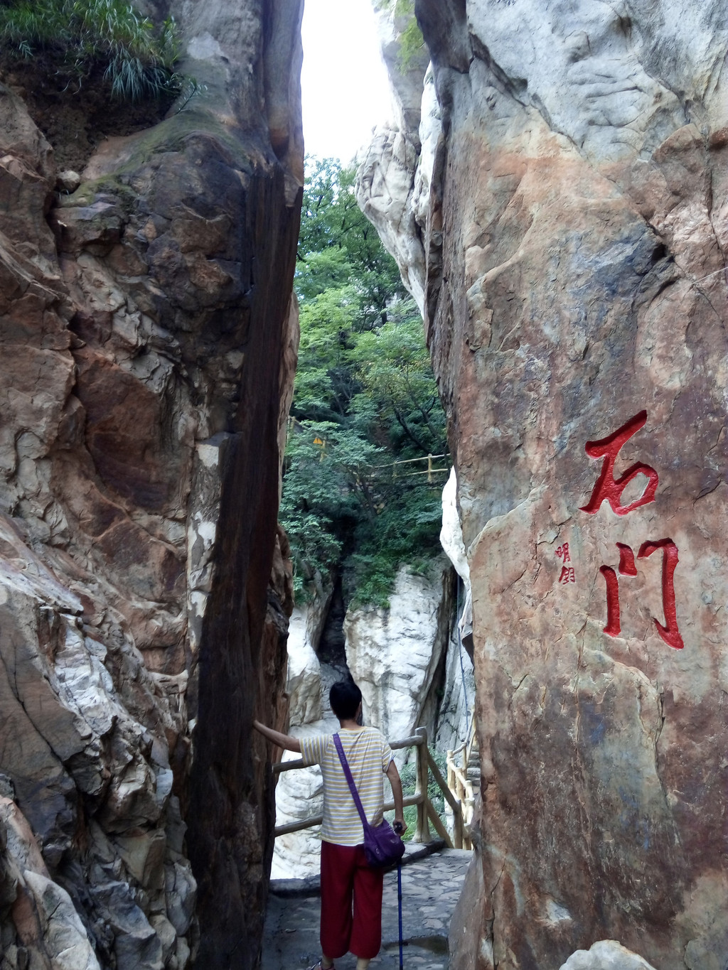 后来上网查询得知仅书册崖至三皇寨的路程就长达3.6公里,扣减后索道上站至三皇寨路程将近4公里,也就是说实际上我们走了全程的4/5,往返就是近8公里了。另一网友《嵩山少林寺书册崖三皇寨穿越》一文,记载其沿途各点用GPS测量出缆车上站至三皇寨的距离也达到3.84公里,可以印证上述数字,因此,这是一段漫长艰巨的行程,你如果时间或体力有限,大可不必一直走到三皇寨,我认为少室山美景不在三皇寨而在去三皇寨的途中,特别是前半程,下缆车后只要大约走1公里,最多2公里即可折返。从三皇寨下去至南出口还有1.1公里,但海拔陡降300多米,全是大段的下山阶梯,中间还有个好汉坡,听其名就令人生畏,据说出口外的交通也不方便,于是我们原路返回,到索道下站时已近12点,上午竟走了4个多小时,还好上午是个阴天,不然真要被晒死了。从少室山下来后,我们也顺路到少林寺和塔林逛了逛,