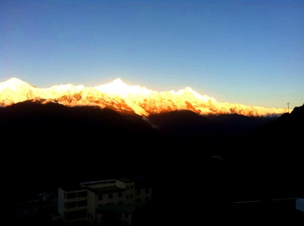 6点50分,我早早的起了床,拖着昨天“明永冰川”留给我的“礼物”拉开了窗帘。哇!!!梅里雪山完完全玩的展现在我面前,不过最精彩的日照金山还没开始。和小伙伴用过早餐后,隐约听到酒店走道的阵阵骚动。难道?我们又开始忘记高原禁止奔跑的警告,一路狂奔....................