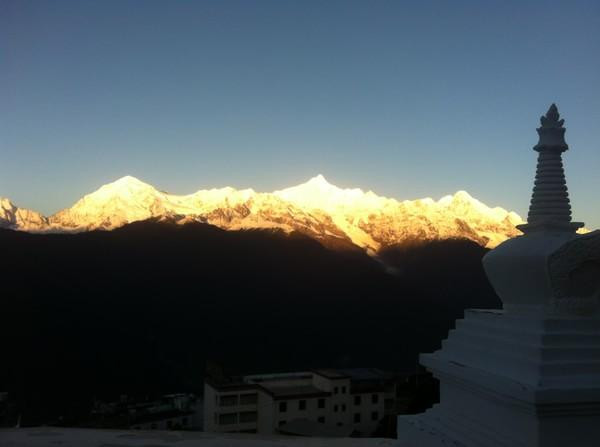 今天领队终于让我们睡到了自然醒,9点半才开始正式向梅里雪山的明永冰川进发。不过我们怎么可能辜负这个一个美好的清晨。可能是我们昨天的祈祷见了成效,虽然没有看到日照金山,不过至少今天我们先见到了梅里雪山的全貌。