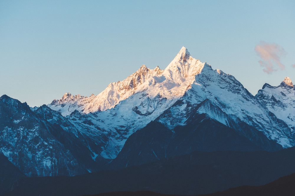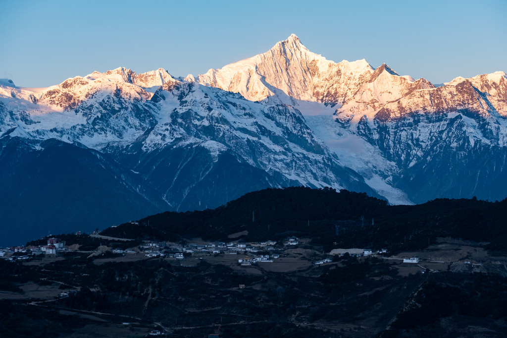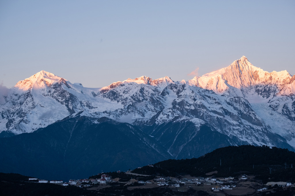 第三天的重头戏——看日照金山!看金山是要碰天气的,我们只在德钦住一晚,所以心中有些忐忑,头一天小哥给了我们日出时刻表,8:00开始,我们7:45就架好了相机,其实7点不到就醒了,隔壁养了几只鸡,天不亮就开始打鸣,特别卖力,一刻没停,比闹钟还给力!天放亮的时候先是天空慢慢变白,雪山的轮廓逐渐清晰起来,清冷而庄严,8:00,在一角山峰上跳出了一抹亮色,像展开画卷一样,阳光从山顶往下弥散开来,差不多持续了20分钟,整座山都浸在阳光中,天已大亮,新的一天开始了!